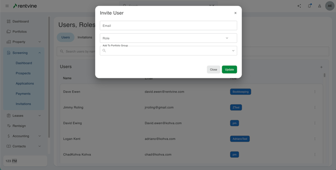 - To invite a user, you can click the blue "Invite User" button. This will pull up a side tab where you can enter the email address of the person you are trying to invite, and you can select the role for their login.