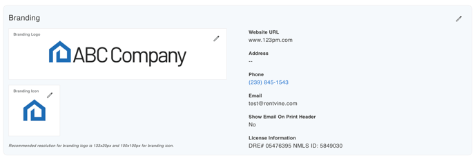 - The next thing will be the "Branding" section. This will be the info that is pulled on reports and owner statements within the system. This contains the following fields: