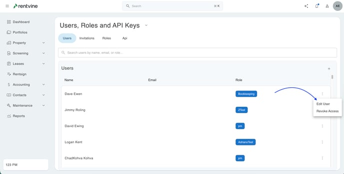 - After a user is created and their role is set, you can still make changes. To do this, you can click the ellipses next to the user. In here, you can either change the role or revoke access from the user.