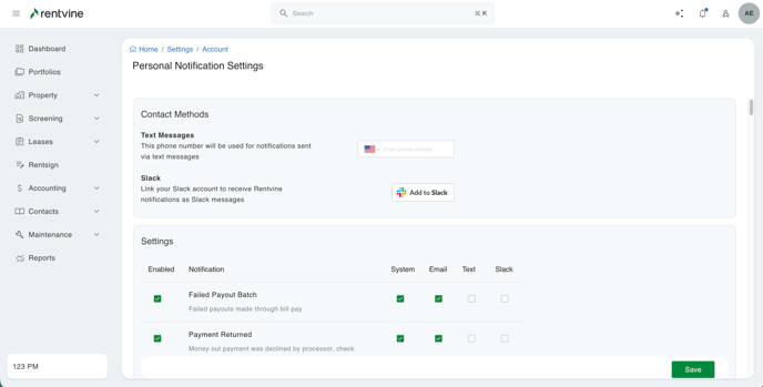 - Personal notification settings allow every user in the system to customize the notifications that they need to receive. From here, the user can also configure if they would like to receive notifications by text or Slack.