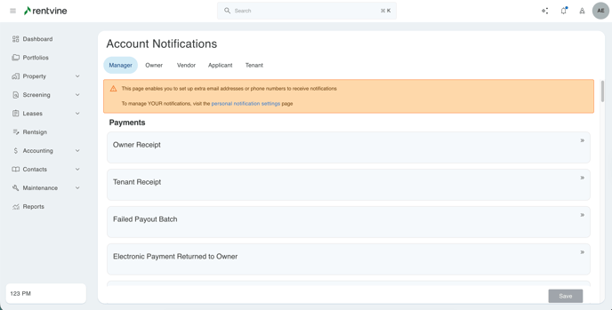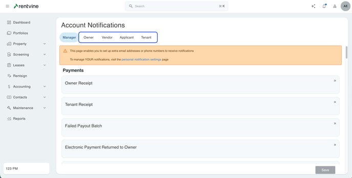 - From this page, you will also be able to configure notifications that are sent out to the owner, tenants, and vendors by clicking on the designated tab.