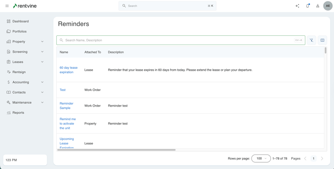 - The reminders tab is going to be a global hub for all of your reminders in the system. On the main page, you will see what the reminder is attached to, the name, description, next reminder date, the users it is attached to, and the contacts.