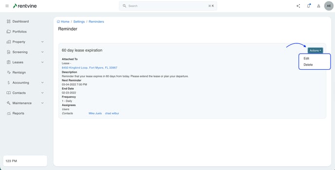 - You can click into each of these reminders. In here, you can click the actions button, and you will be able to edit any information or delete the reminder.