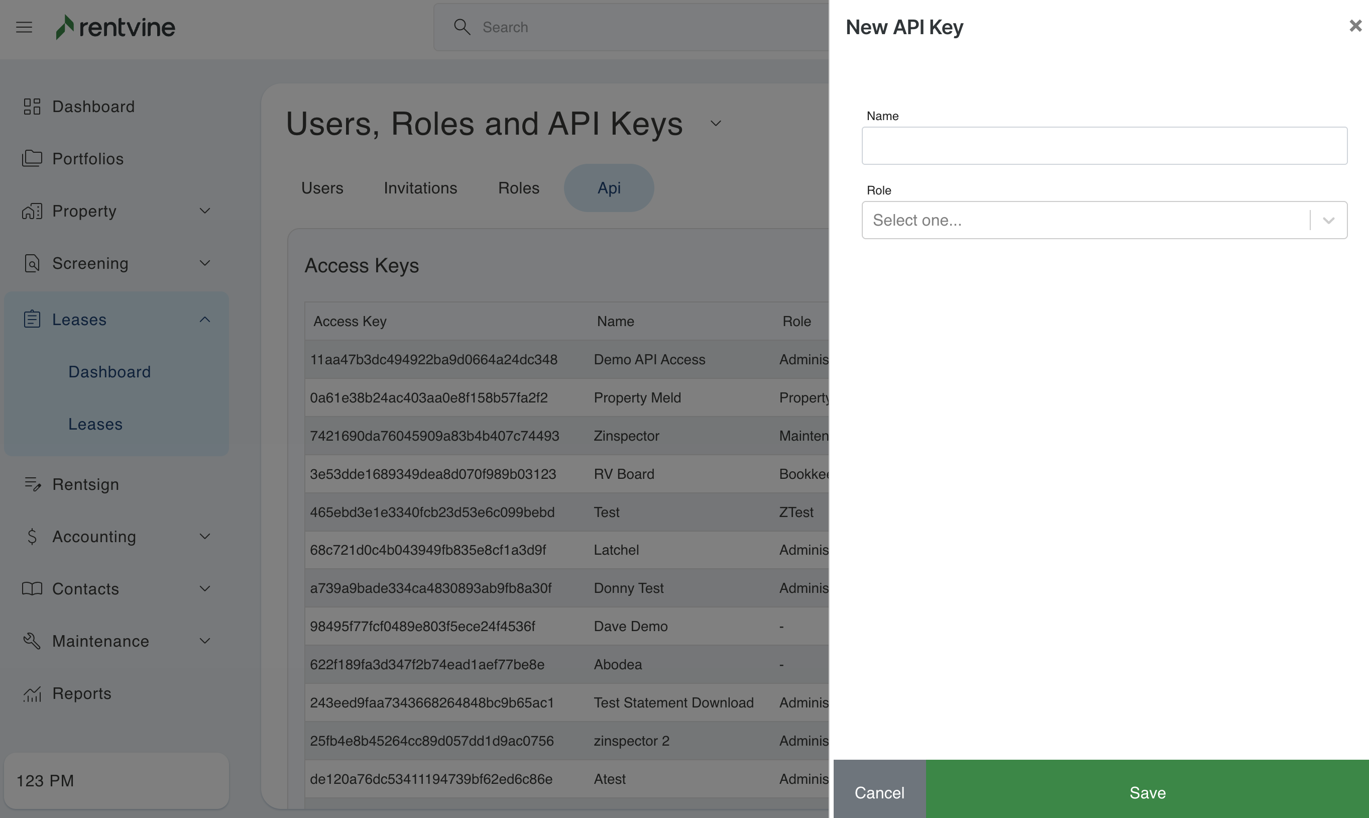 - Here you will enter the name of the API key and then select a role from your list of roles for what this key will allow them access to.