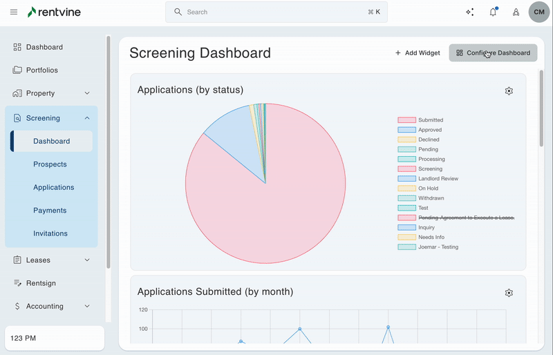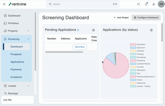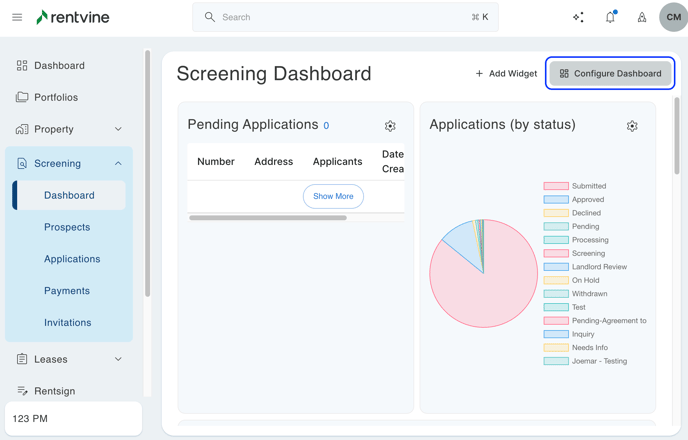 - To view your applications dashboard, you can click the screening tab and then click "Dashboard". This will show you the default screening dashboard and will save any changes made. This dashboard is on a per-user basis, so all users can customize this dashboard to their needs.