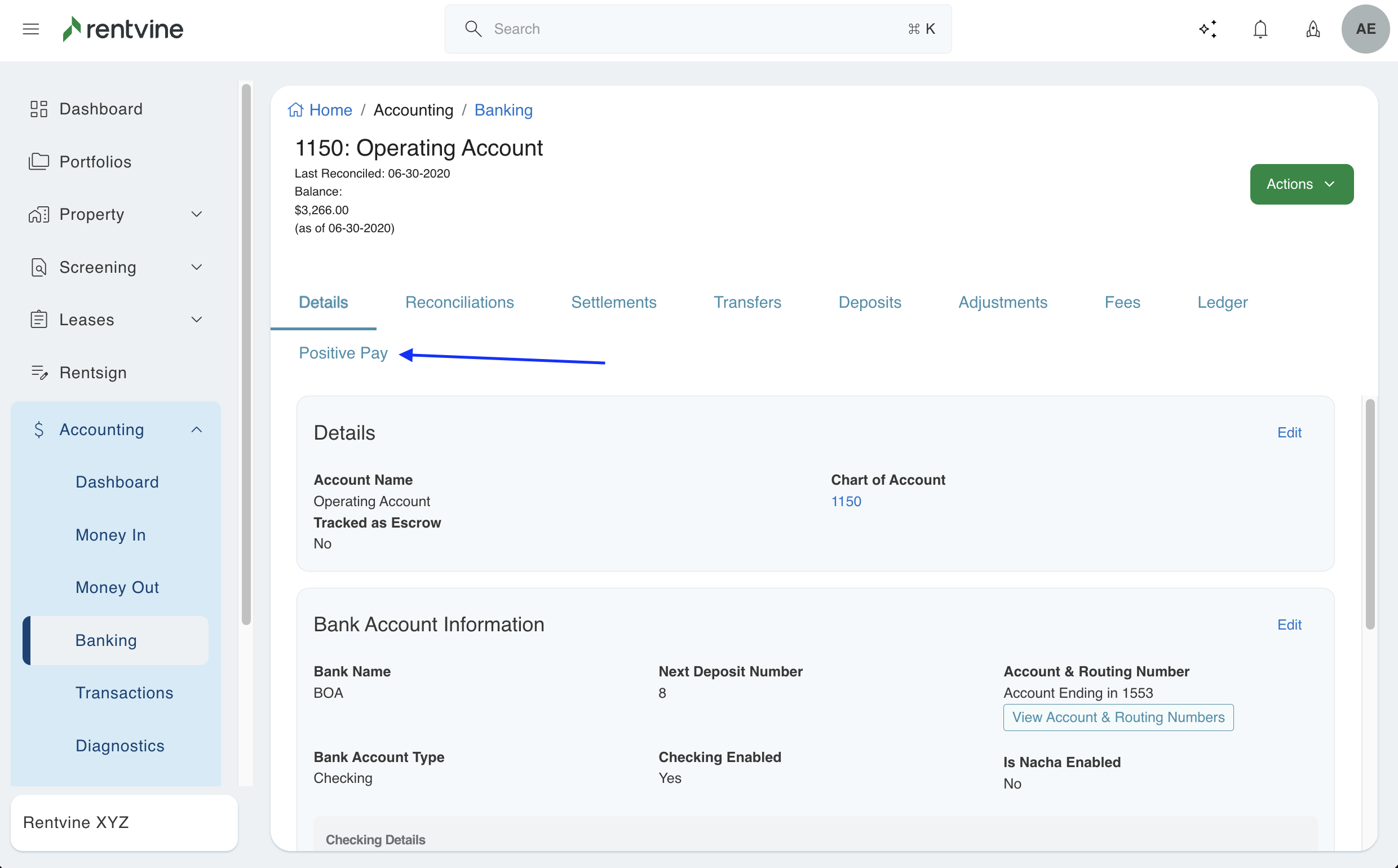 “Positive Pay is a fraud prevention feature your bank offers. Rentvine now automates this process so your check data is sent securely and automatically—no manual uploads required.” |