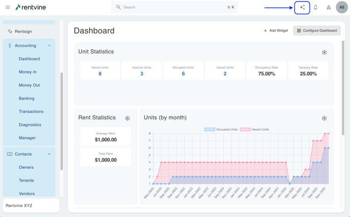 - To access the Gen AI assistant within your Rentvine account you can click on the Gen AI Icon in the top right-hand corner of your screen.