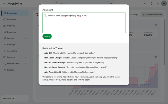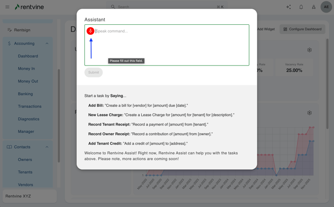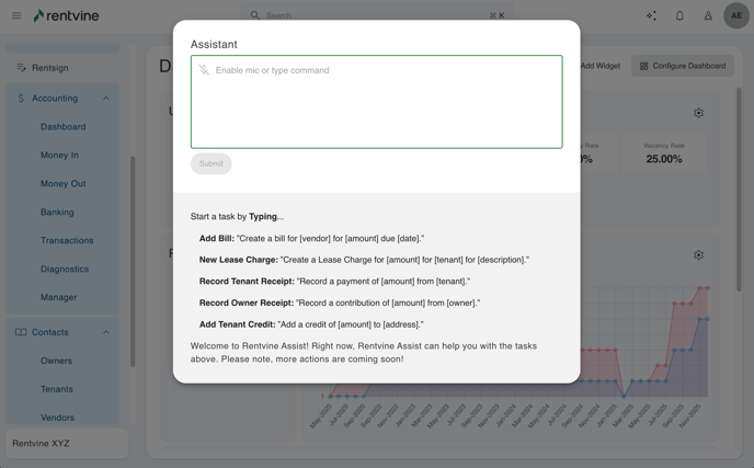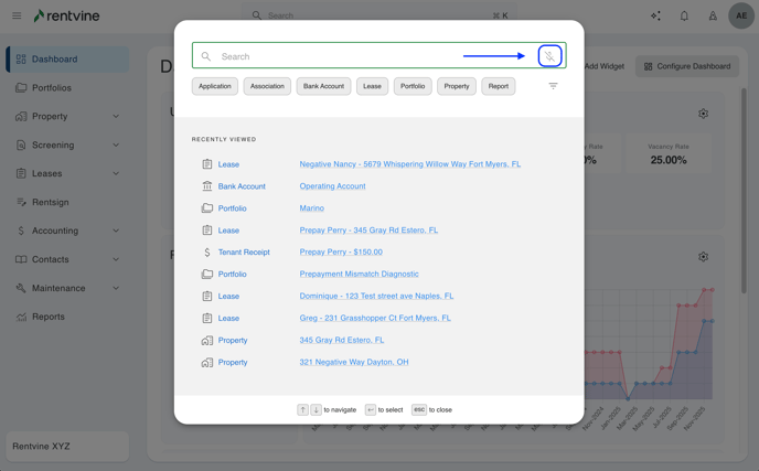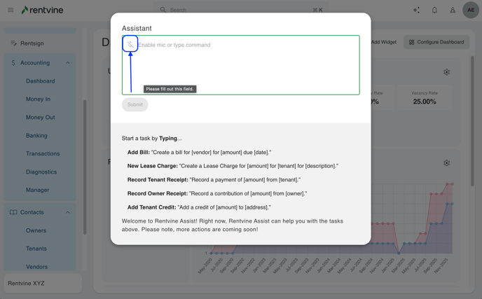 - You can also use a text-to-speech option by clicking the microphone icon. You will then have to allow Rentvine to access your microphone. Once complete you will be able to speak your command to the system.