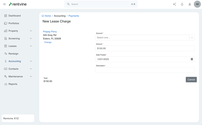- You will see that this processes the request and will take you to the lease charge page for the selected tenant and will prefill all of the information. All that will need to be done is a quick review and confirm the selection by clicking save.