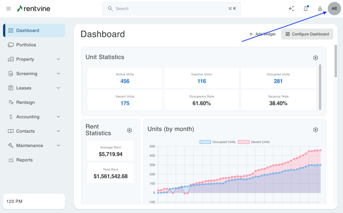 - From the top right-hand side of the screen, click on the profile icon with your initials.