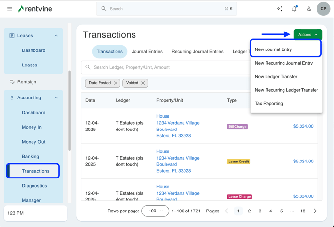 From the navigation menu, select Accounting / Transactions. Then click on the green Actions button and select New Journal Entry.
