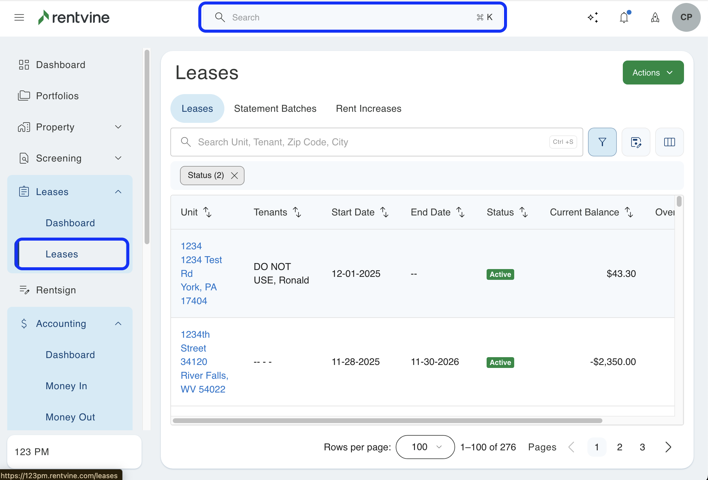 - Search for the tenant or lease by using the Global Search or by clicking on Leases in the navigation menu and selecting the lease.