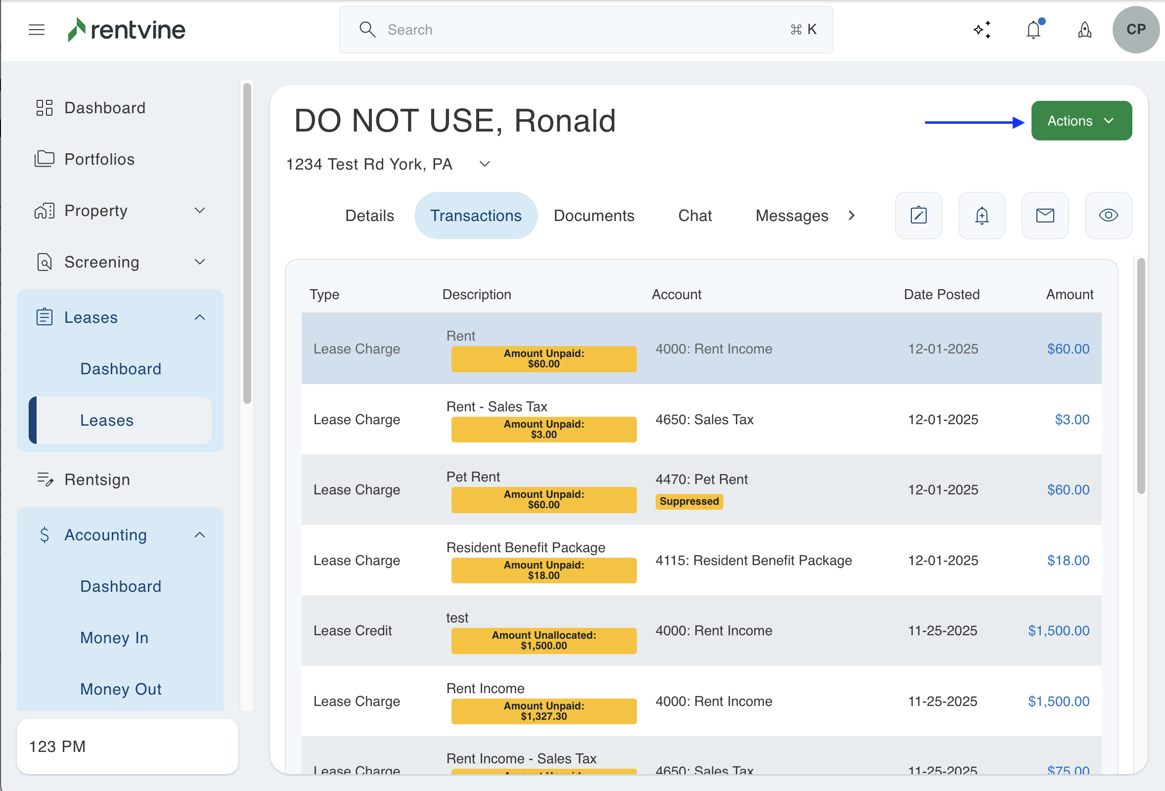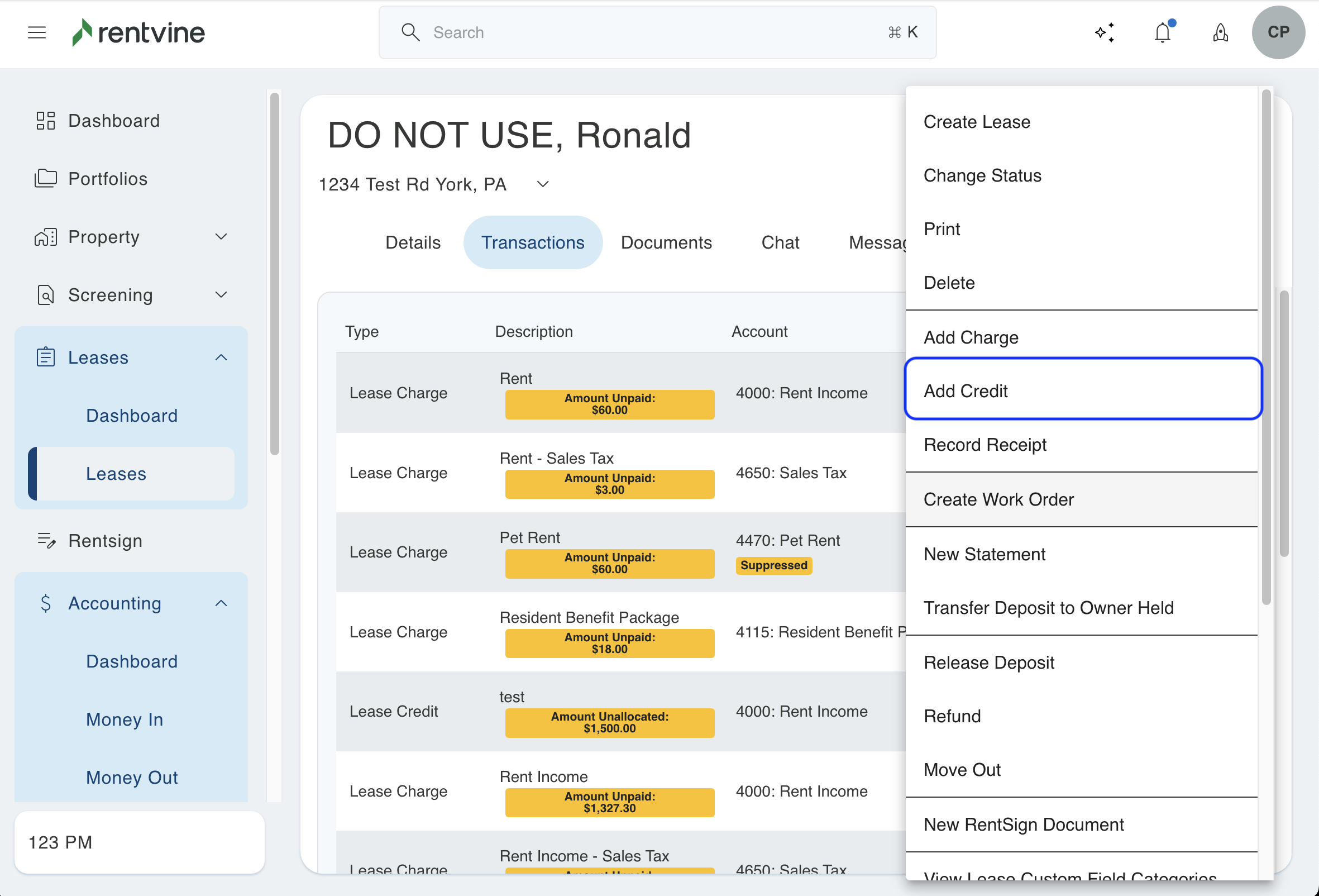 - Once you are on the lease details page, click on the green Actions button and select Add Credit.