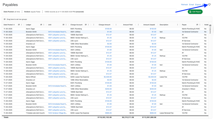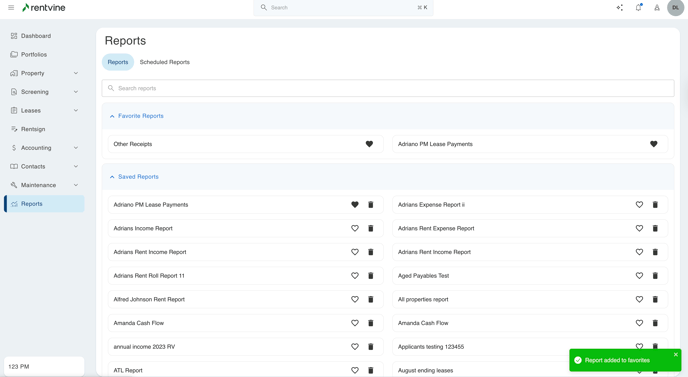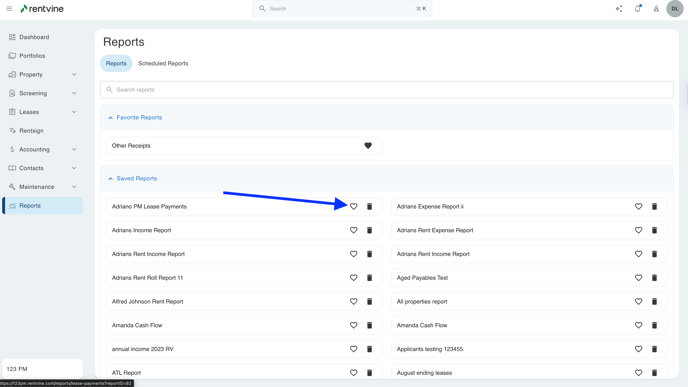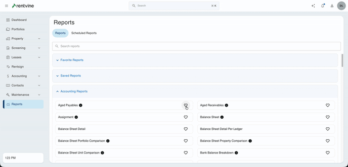 Favorite reports are per user. This means that each user in your Rentvine account can set their own favorite reports based on the reports that they run the most.