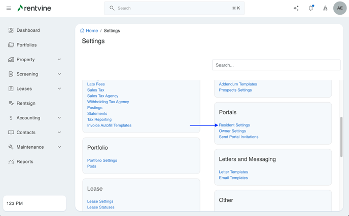- You will then navigate to "Resident Settings," which will be under the section for "Portals."