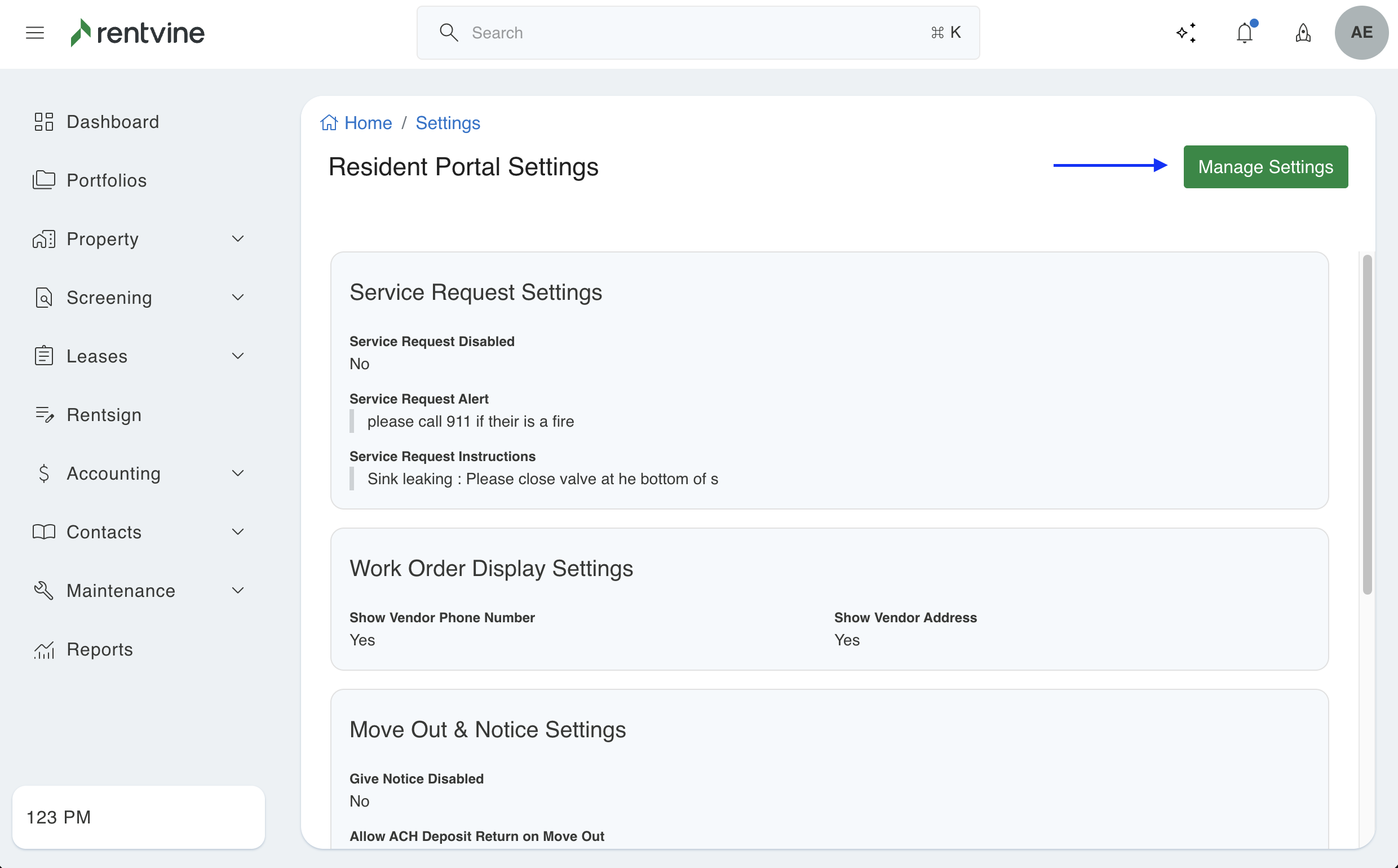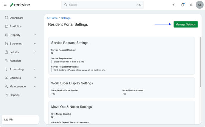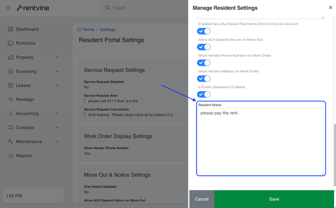 - Here, you will notice a section that is labeled "Resident Notice". You can click the "Manage Settings" option at the top right of this page to edit this field. Here you will be able to enter whatever you need to display in the resident portals.