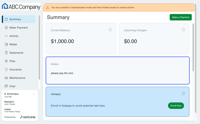 - This will be displayed at the top of the resident portal summary page and will be the first thing that the resident can view when logging in to their portal.