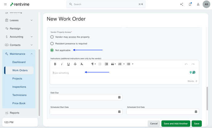 - Now, when creating a new Work Order with this property, if you scroll down to the vendor Property Access and you select Vendor May Access The Property, you will notice those instructions transferred over from your saved settings.
