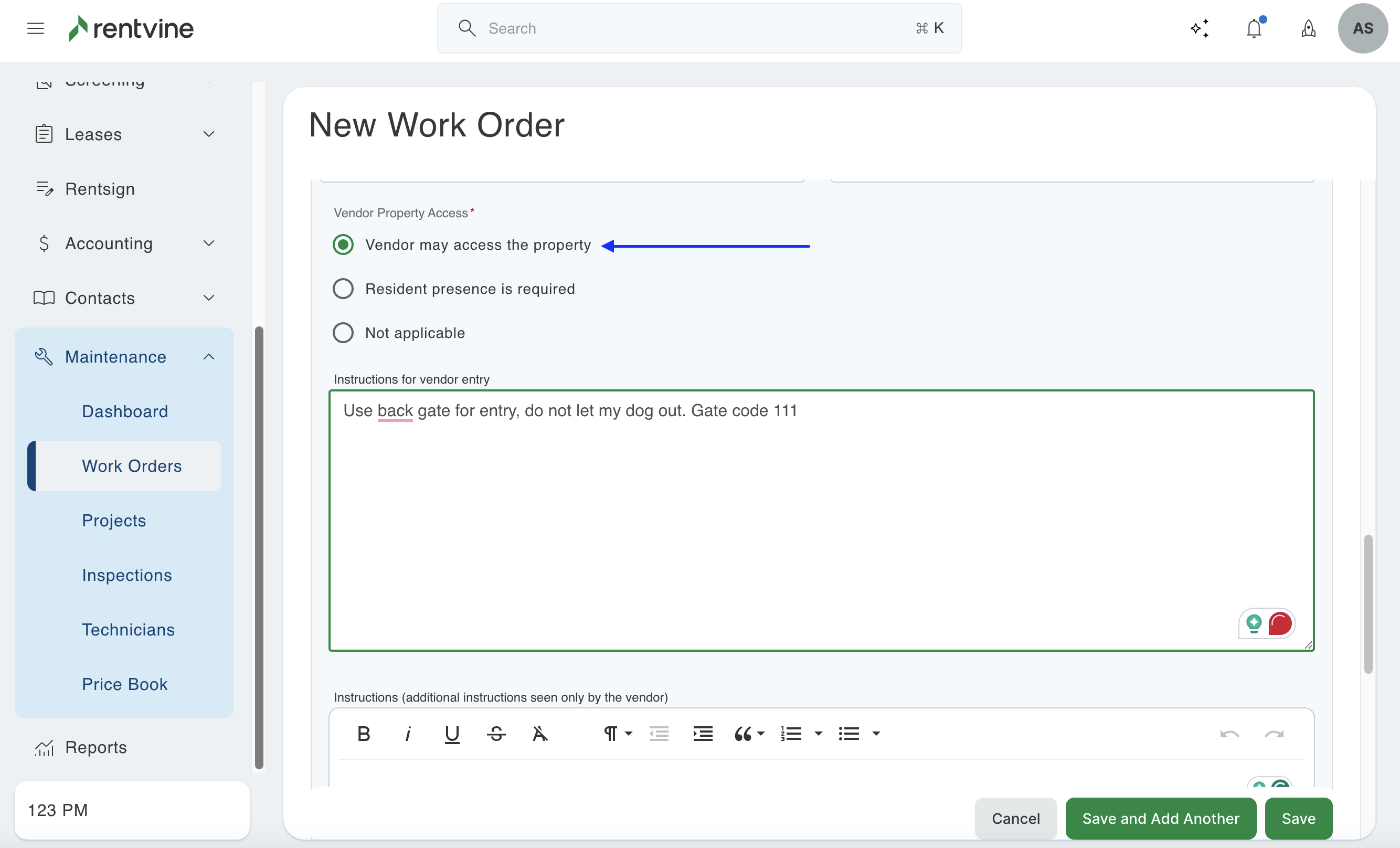 This new feature only applies when choosing the option "Vendor May Access the Property." If you select any other option, you will still have the ability to add additional notes, but the automated entry instructions will not be included.