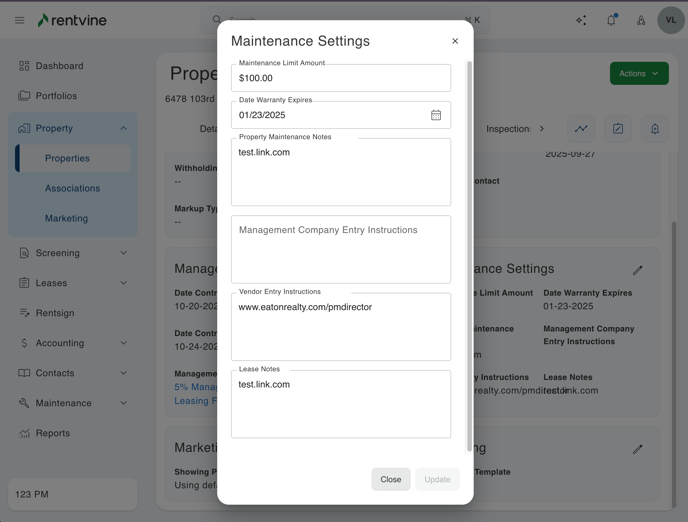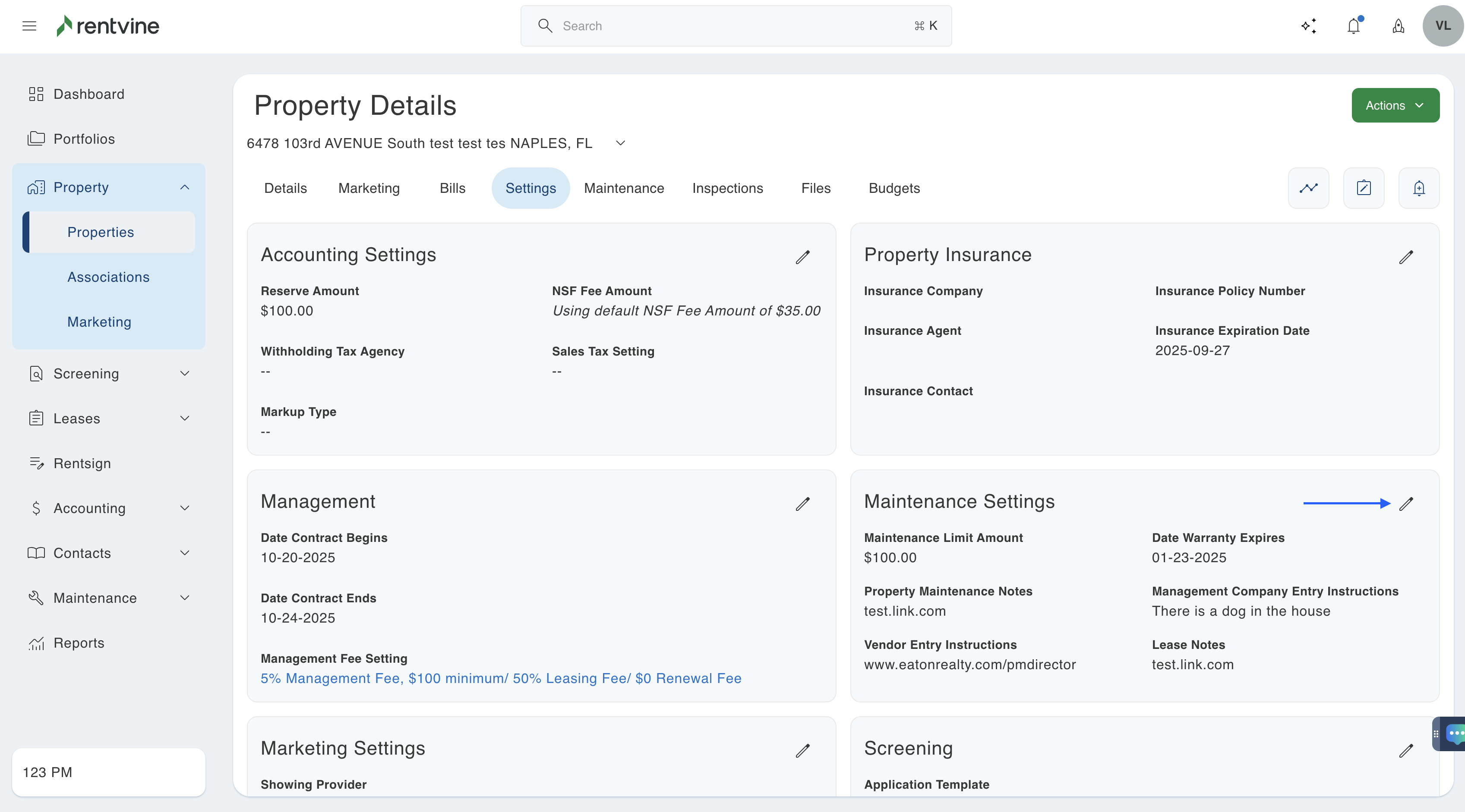 - From the Settings tab on the property on the right side you will notice the maintenance settings, go ahead and click on the pencil icon to edit.
