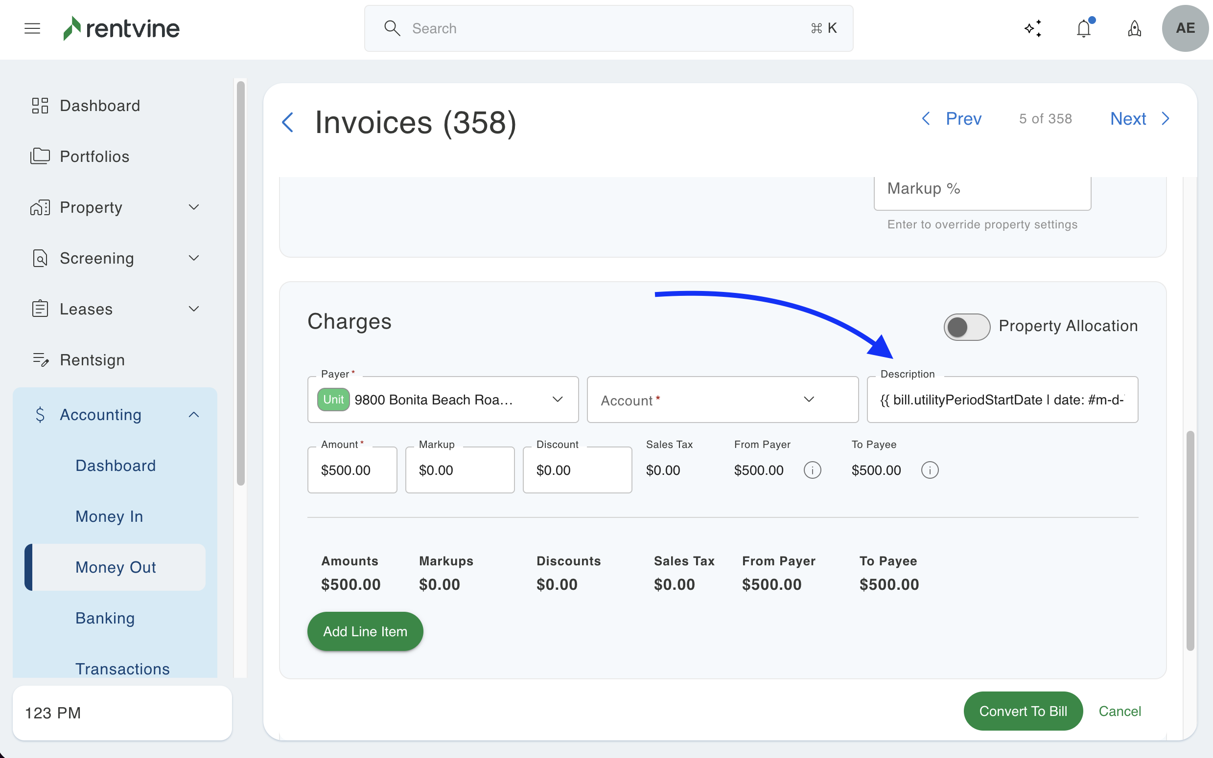 - Clicking into the invoice, you will notice that the memo, bill description, and charge description are already prefilled with the information from the template. This will also include the hot field script and will populate the data once the invoice is converted into a bill.