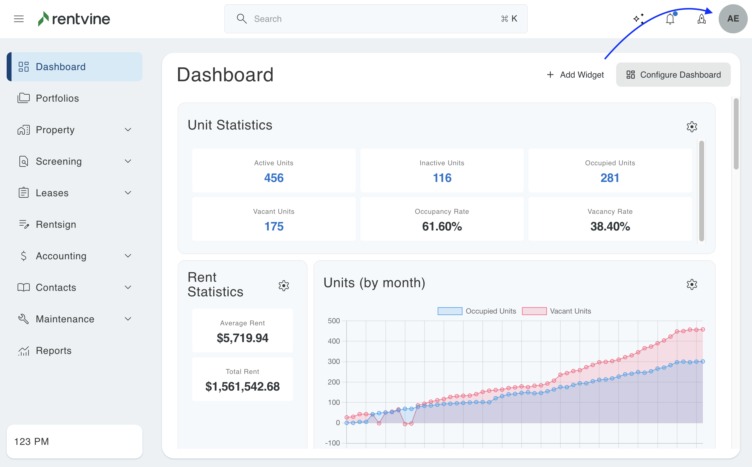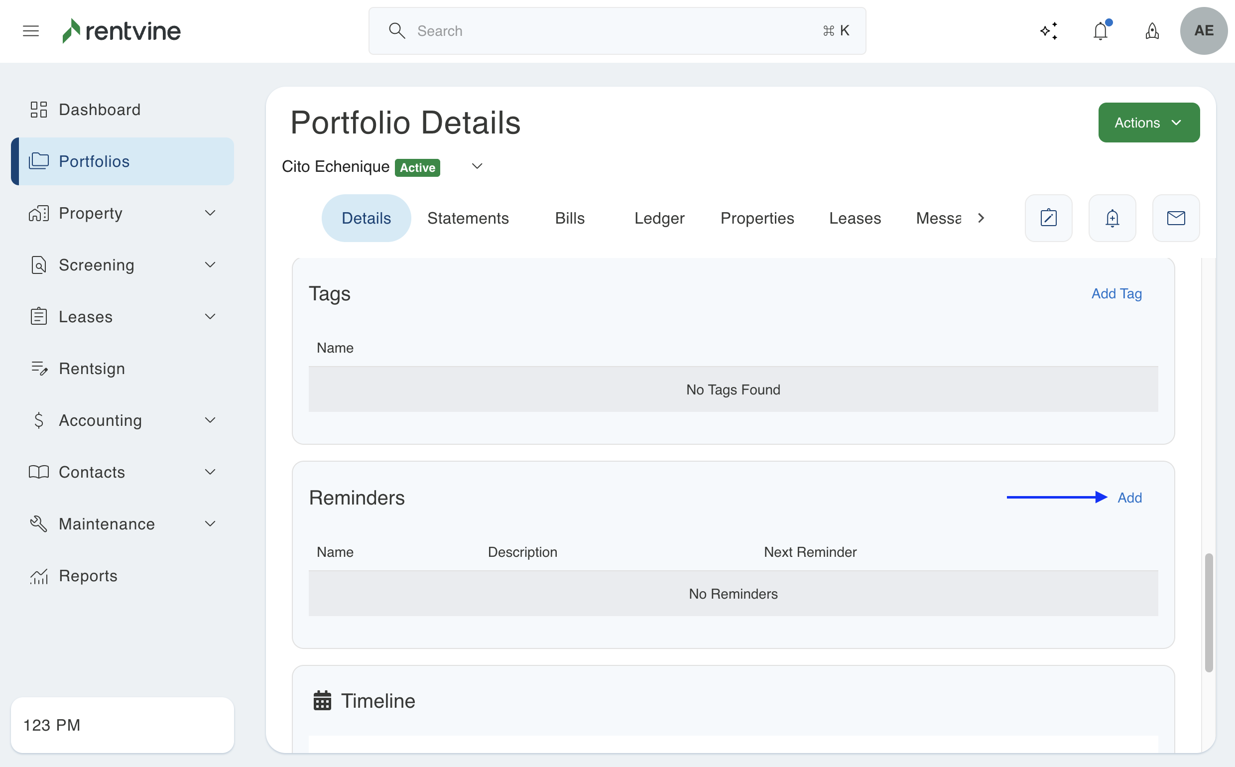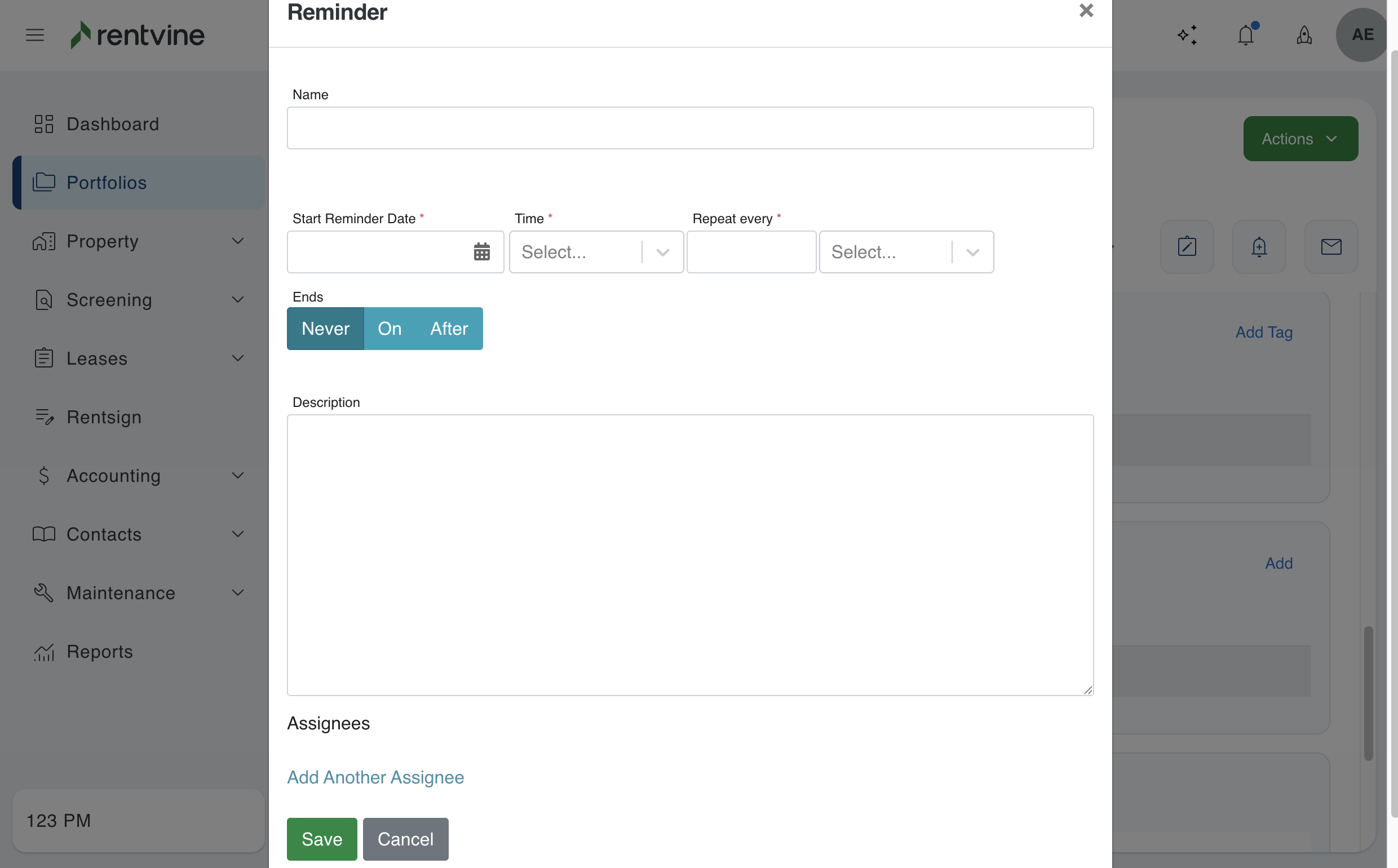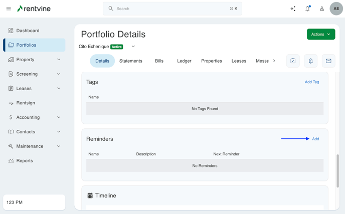 In this article, I will be showing you how to get a reminder created. For this example, we will be navigating in the portfolio section of Rentvine.