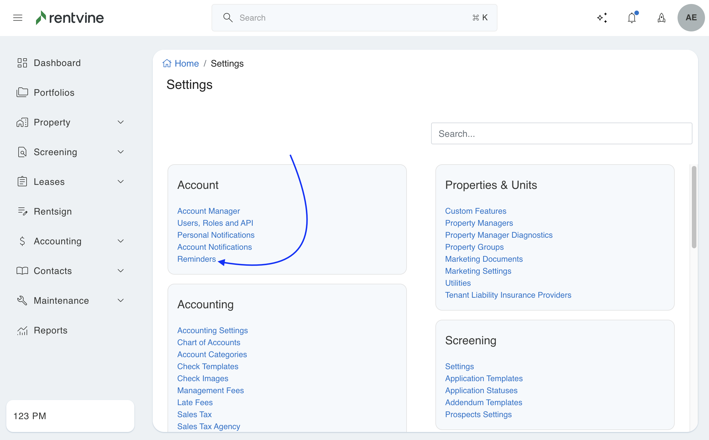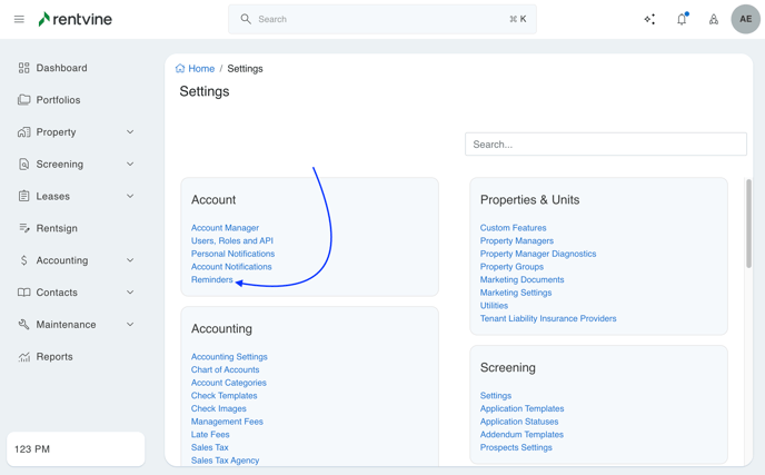 There is also a global reminder section, where you can view all reminders you have created in Rentvine. Please follow the steps below to see this in your Rentvine account.