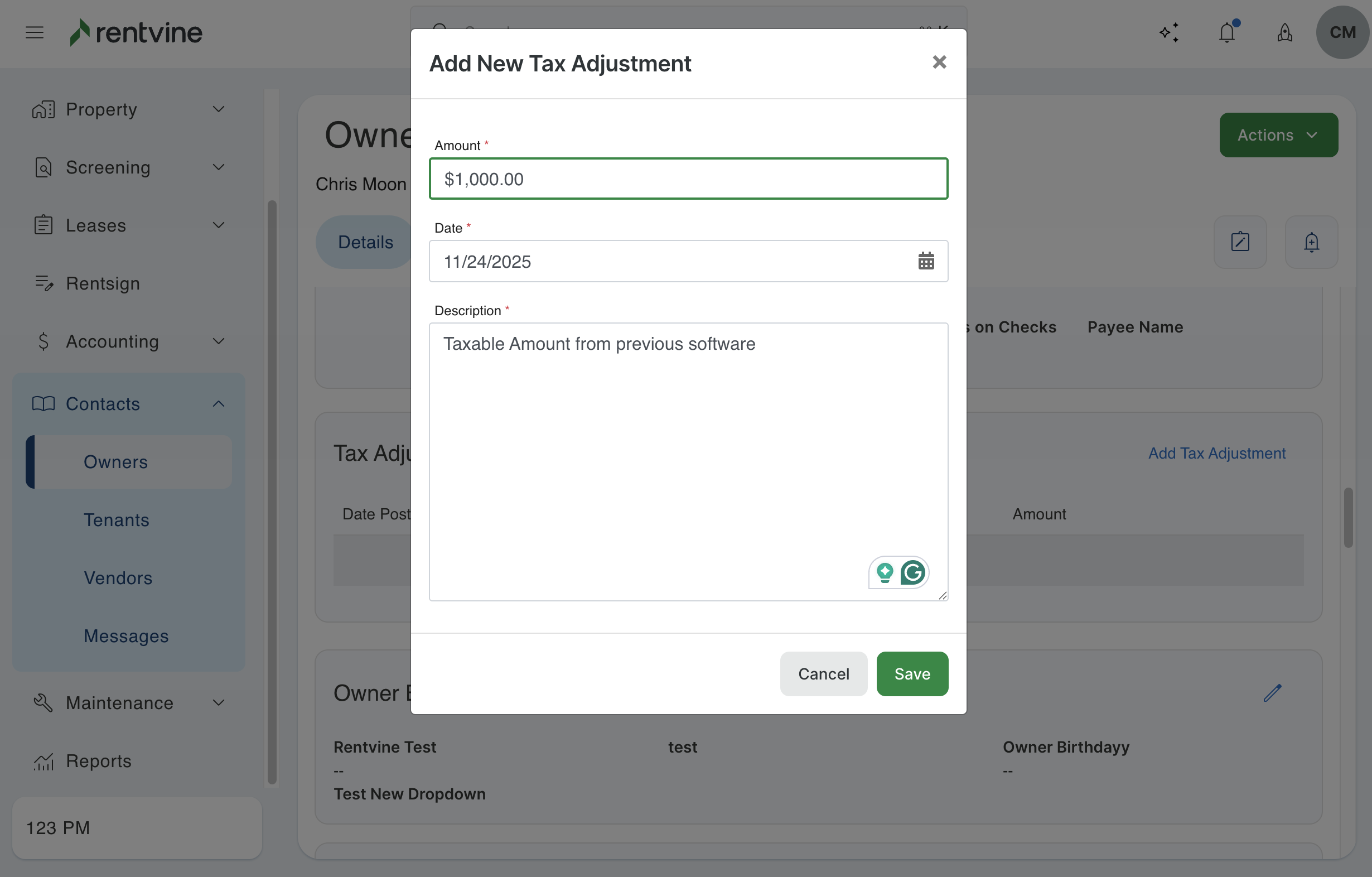 Find Contact (Owner or Vendor) and enter 1099 adjustment