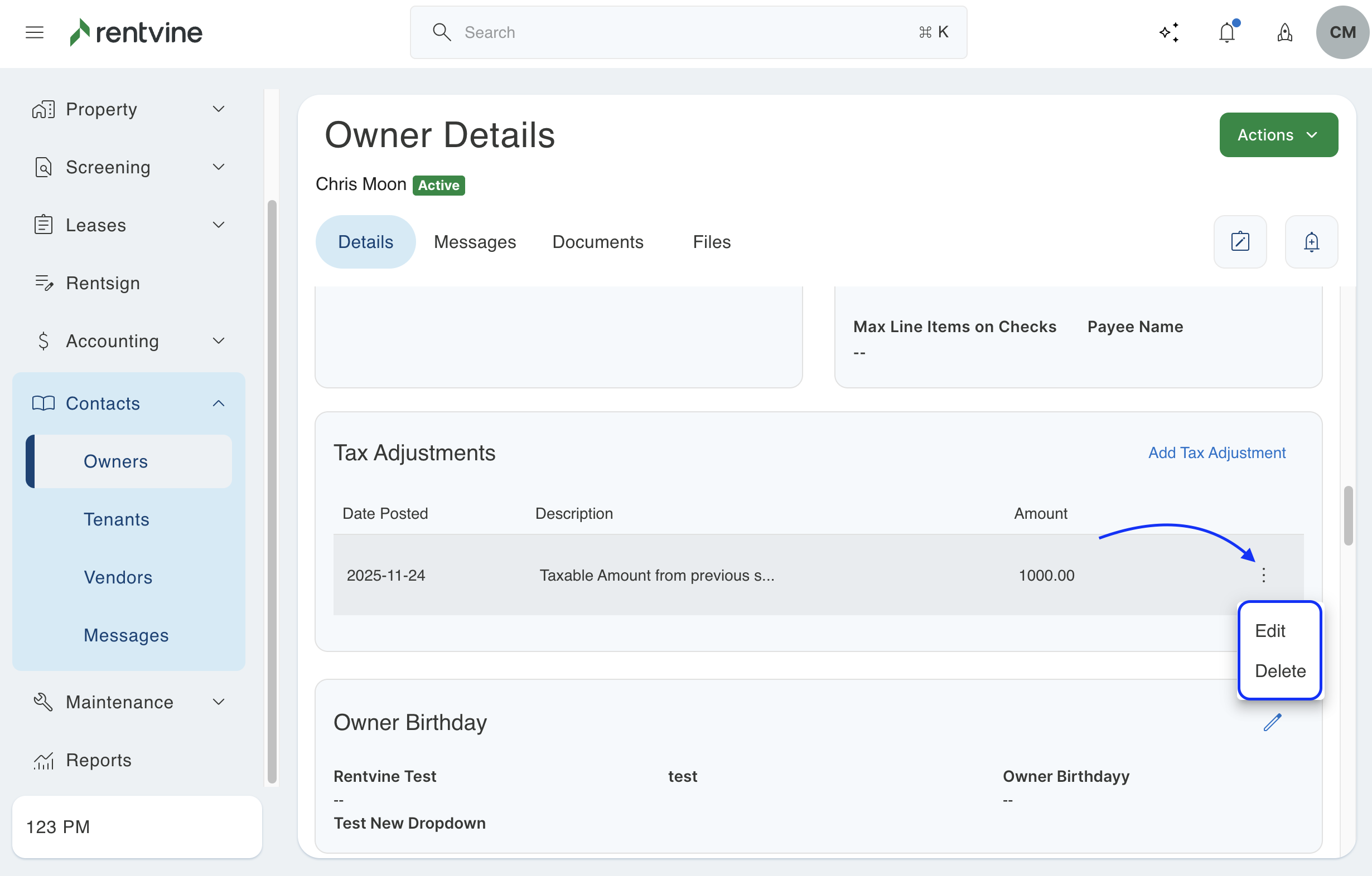 - Once the amount has been entered, it will show in the Tax Adjustments card. If you need to edit or delete the entry, you can click on the 3 dots on the far right of the entry. You will be given options to edit or delete.
