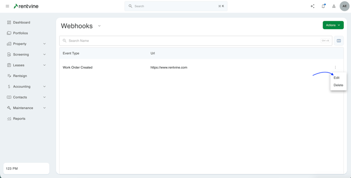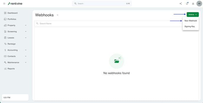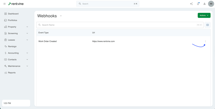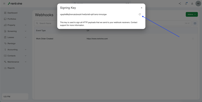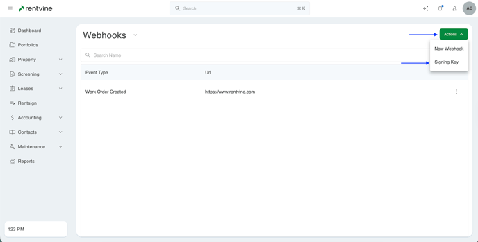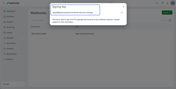 - Also, from the green actions button, you will have the option to view the signing key. This key is used to sign all HTTP payloads that we send to your webhook receivers. This is used to confirm that the data is being sent from Rentvine.