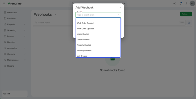 - You will then select an event. This event will record when an action occurs in Rentvine, and it will be sent out to the designated URL.