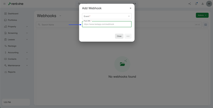 - The next thing you will enter is the "Post URL". This will be the designated URL to which the event information is sent when it occurs in Rentvine. When you are done, you can click "Add" to save that webhook.
