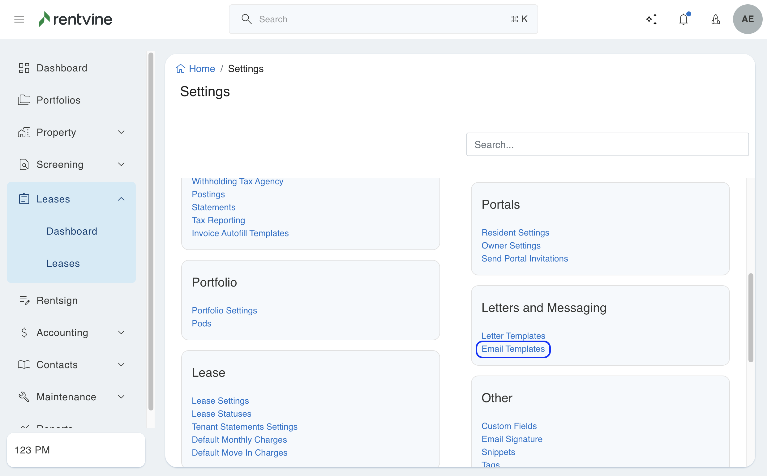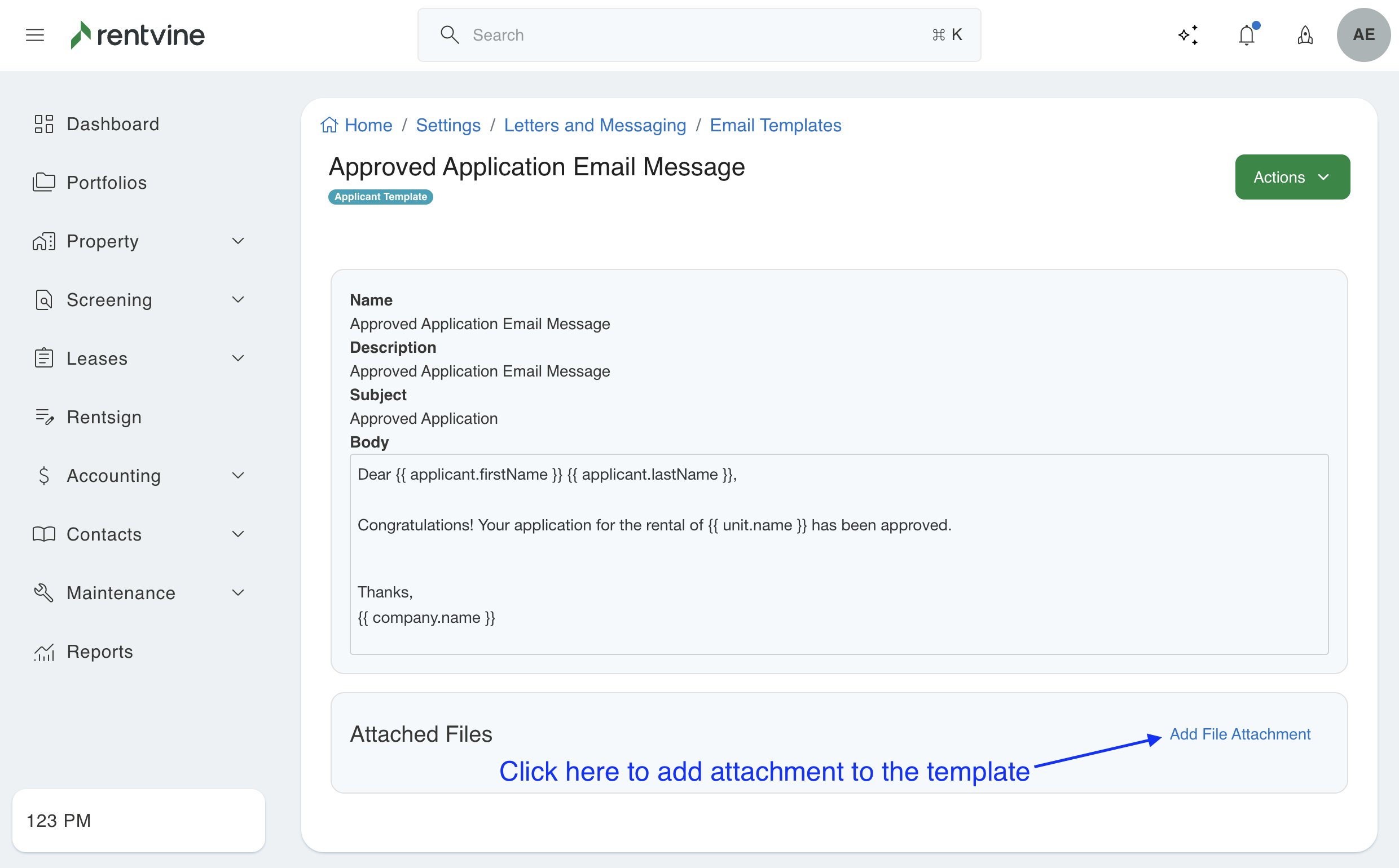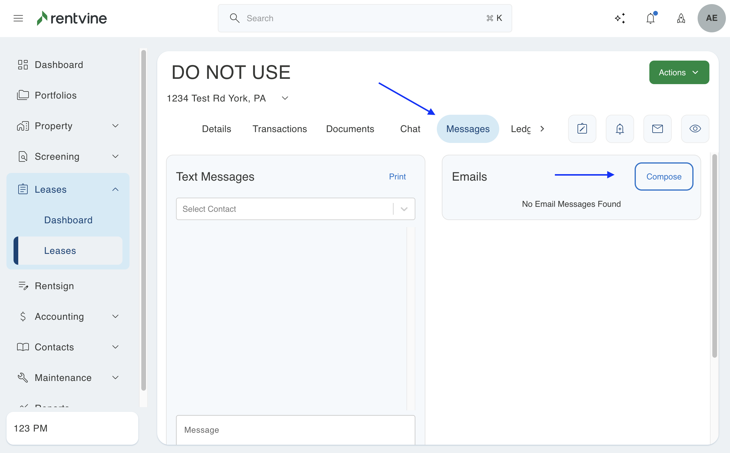 - Once the template has been created it can be used to send mass emails or to send an email by going to the messages tab of a vendor, lease, portfolio, application or work order and clicking Compose. From there you will have the option to select an email template.