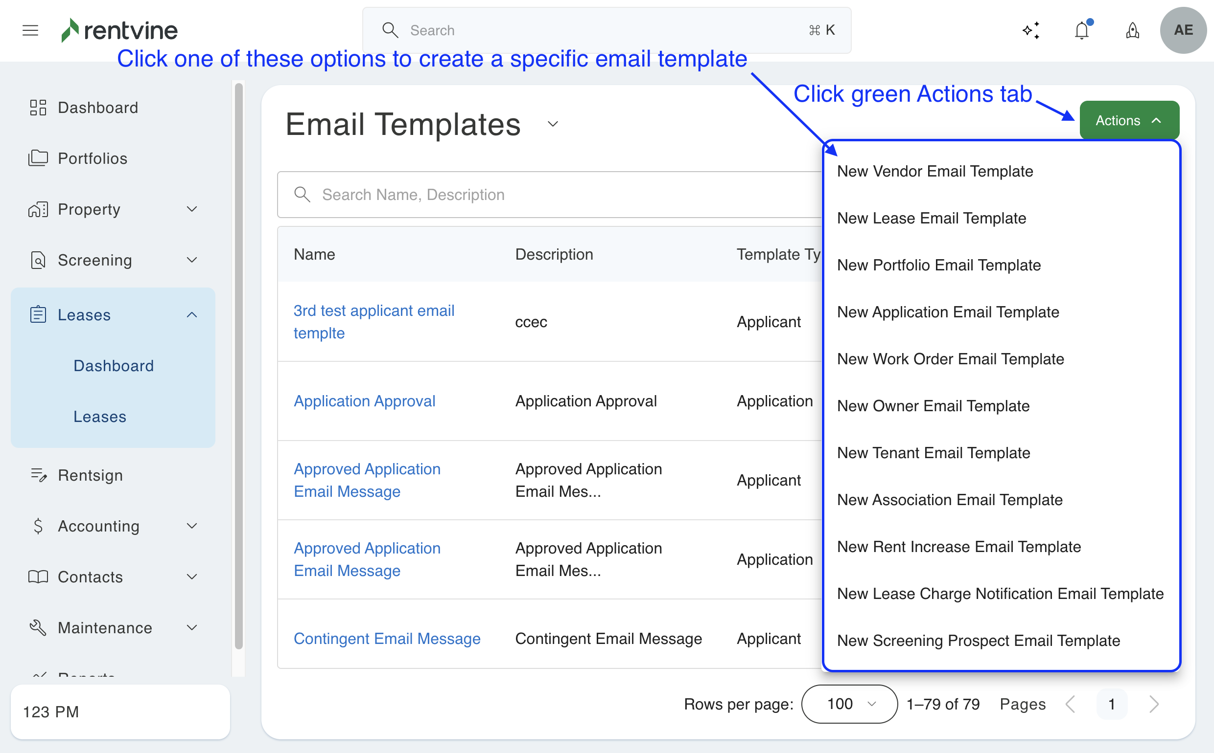 - On the Email Templates screen, click on the Actions button and select the template that you would like to create.