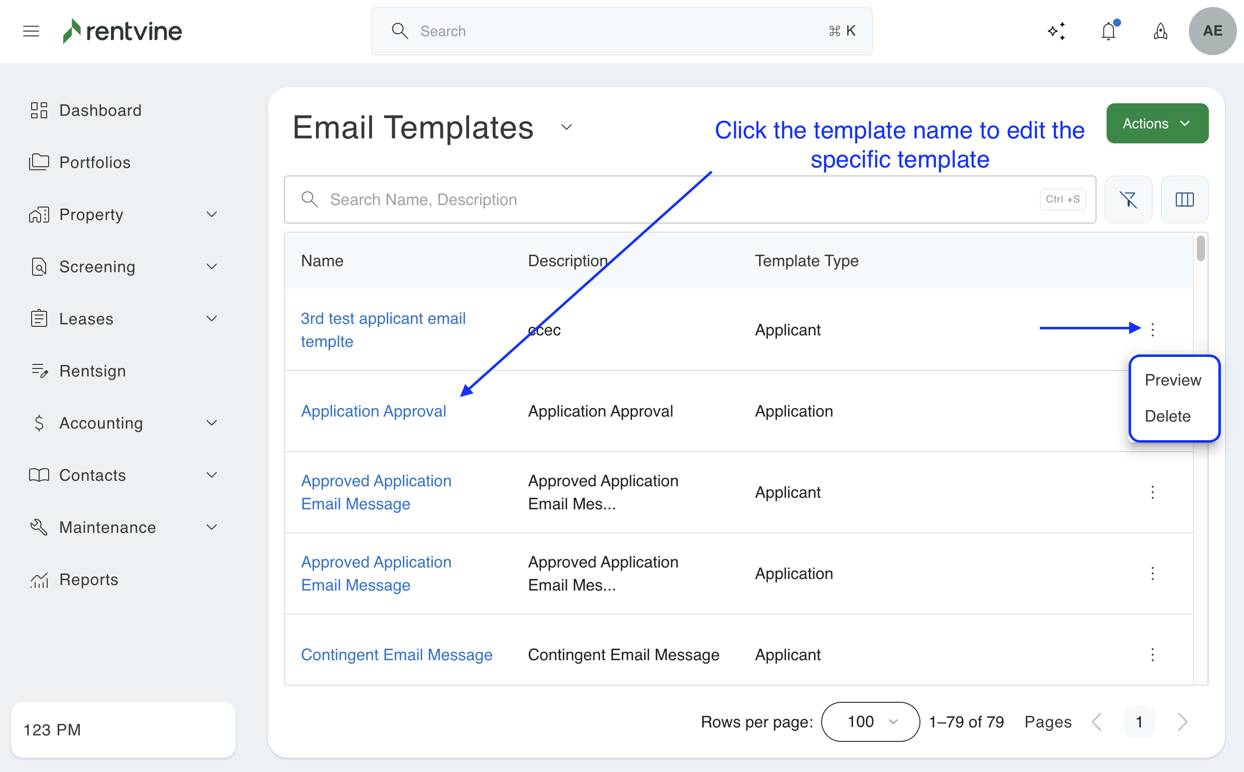 - Once a template is saved you can Preview or Delete it by clicking on the ellipsis menu. If you want to Edit the template just click on its name.