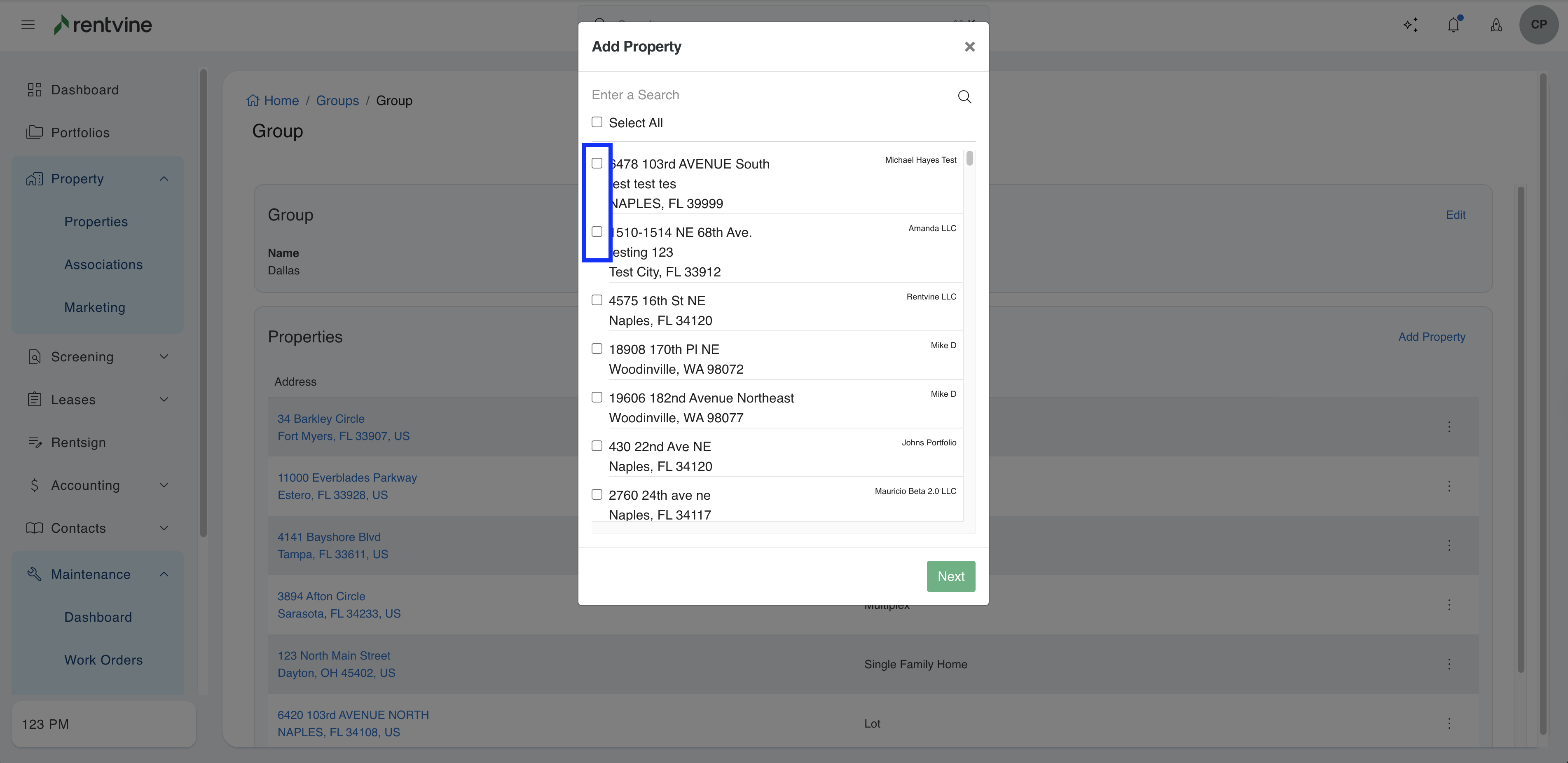 • Check the boxes of the properties you would like to add to the group, and then click Next