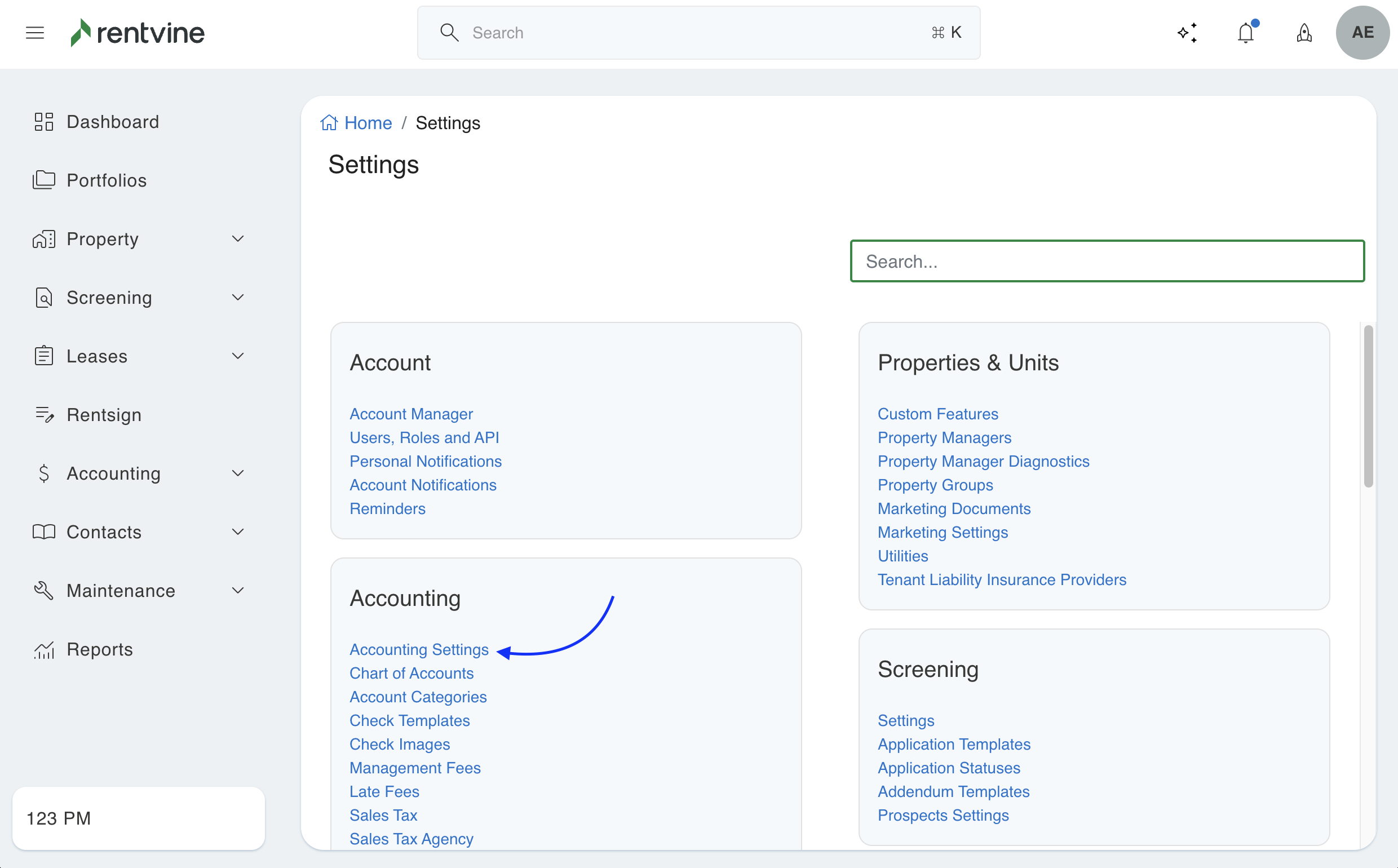 - You will first need to go to your global settings. In here, you will need to click on your accounting settings.