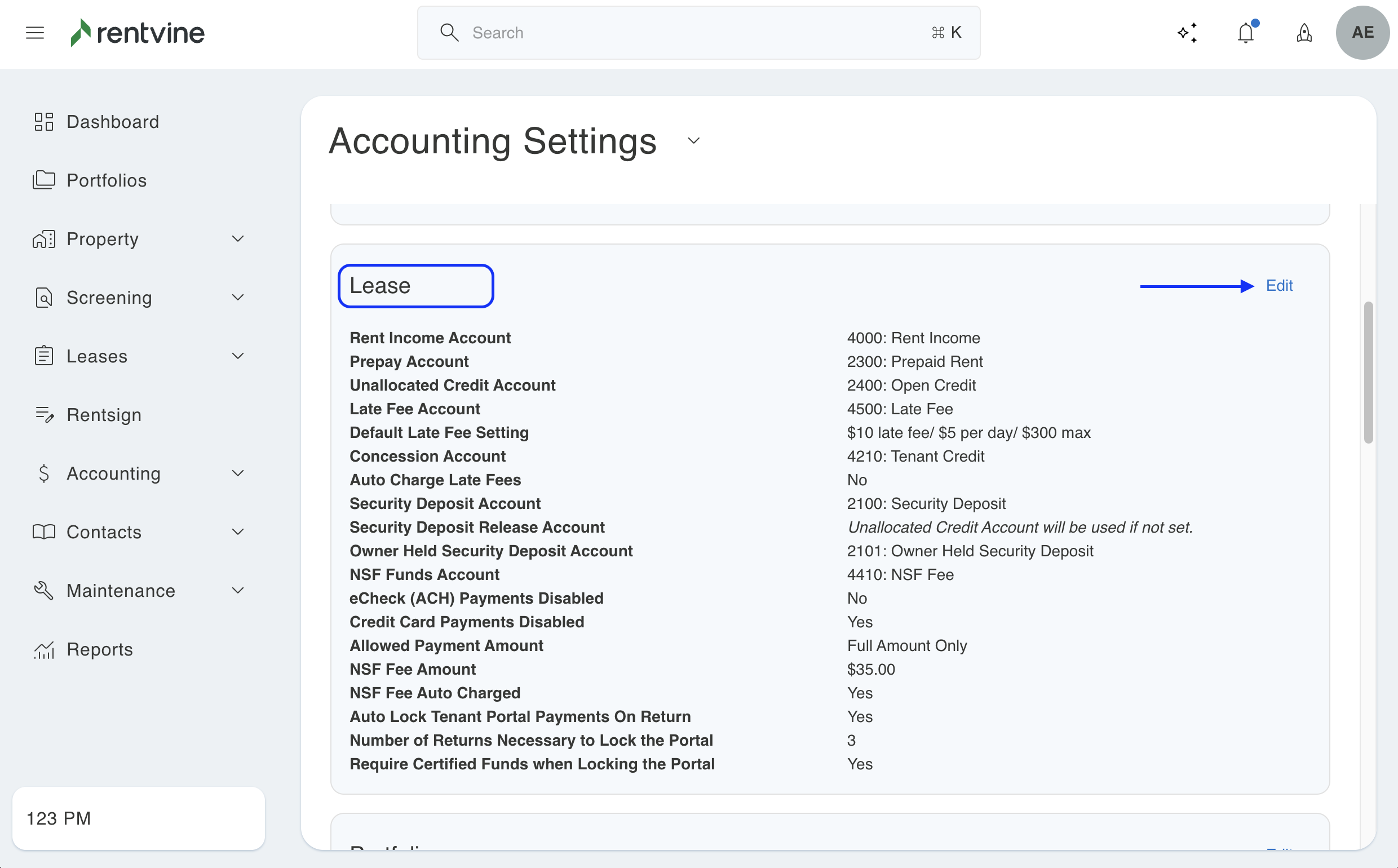 - Scroll down to the leases section and click the edit button in the top right of this box. This will allow you to turn on the toggle for "Auto Lock Tenant Payments on Return." Activating this toggle will allow you to edit two additional fields