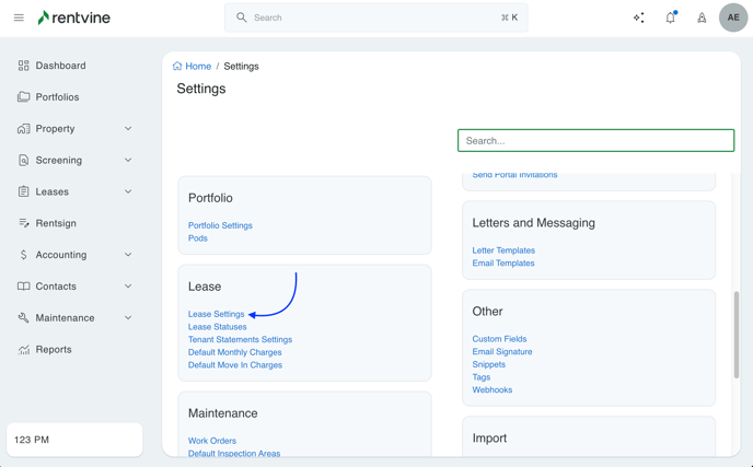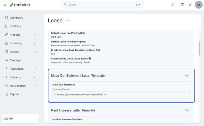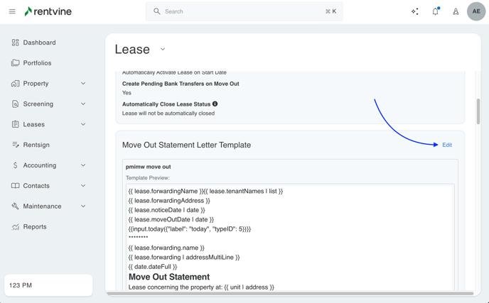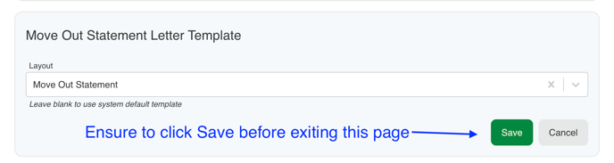 - After the New Move Out Statement is created, you can go to your Lease Settings and adjust the Move Out Statement Template to the newly created template that was just created.