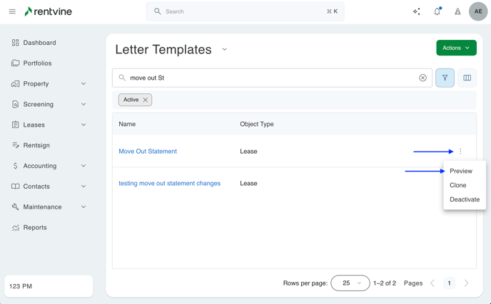 If you would like to see a full preview of the Move Out Statement with information loaded in, you can go back to the Letter Templates Settings > click the ellipses > select Preview on the Letter Template.
