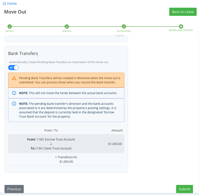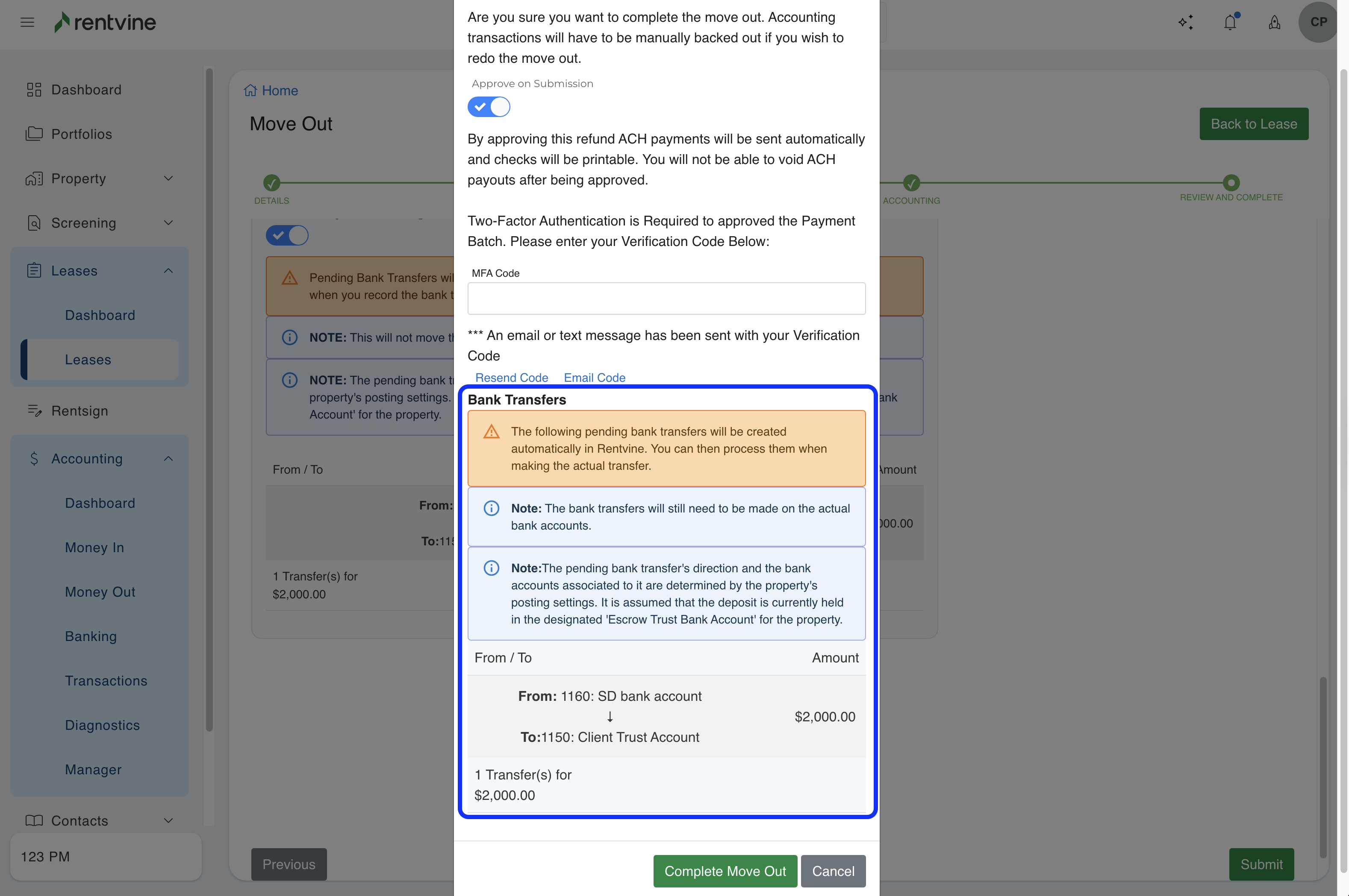 - When you are ready you can click the submit button to complete the move out and this will give you another confirmation on the pending bank transfer. Once you approve the submission and click "Complete Move Out" this pending transfer will be created.