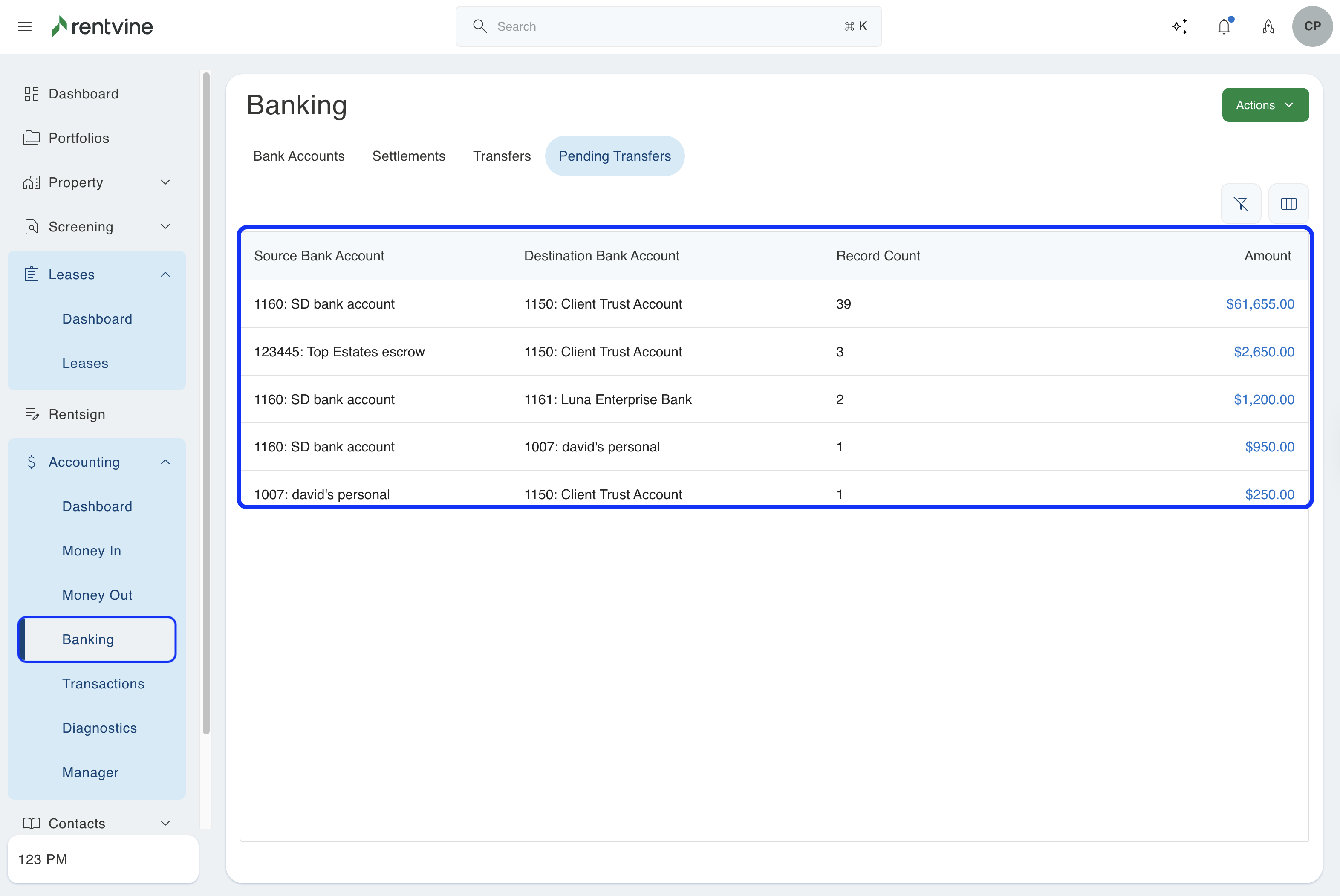 - To view these pending bank transfers you can click on the accounting tab. You will then need to click the banking tab. There will now be a tab at the top of the screen that is labeled "Pending Transfers". This page will show you all of the pending transfers that have been created but have yet to be transferred. This will combine all transfers based off of the bank accounts. I.e. escrow transferring to operating or operating transferring to escrow.