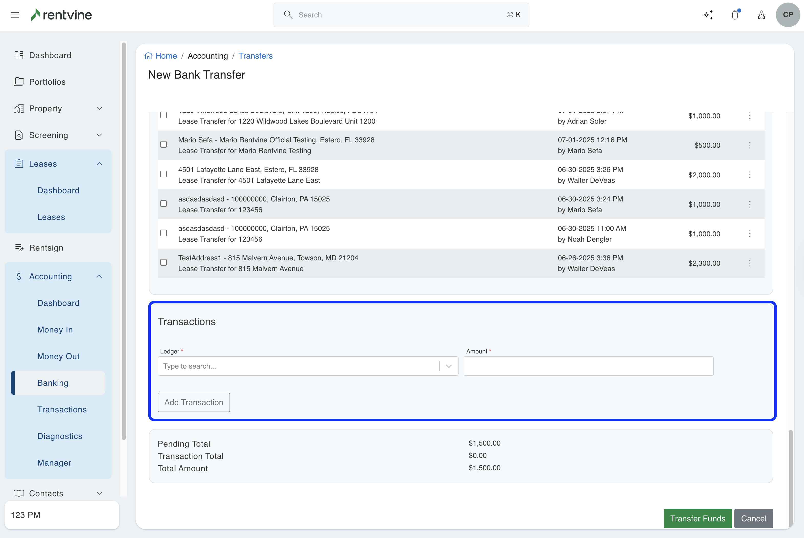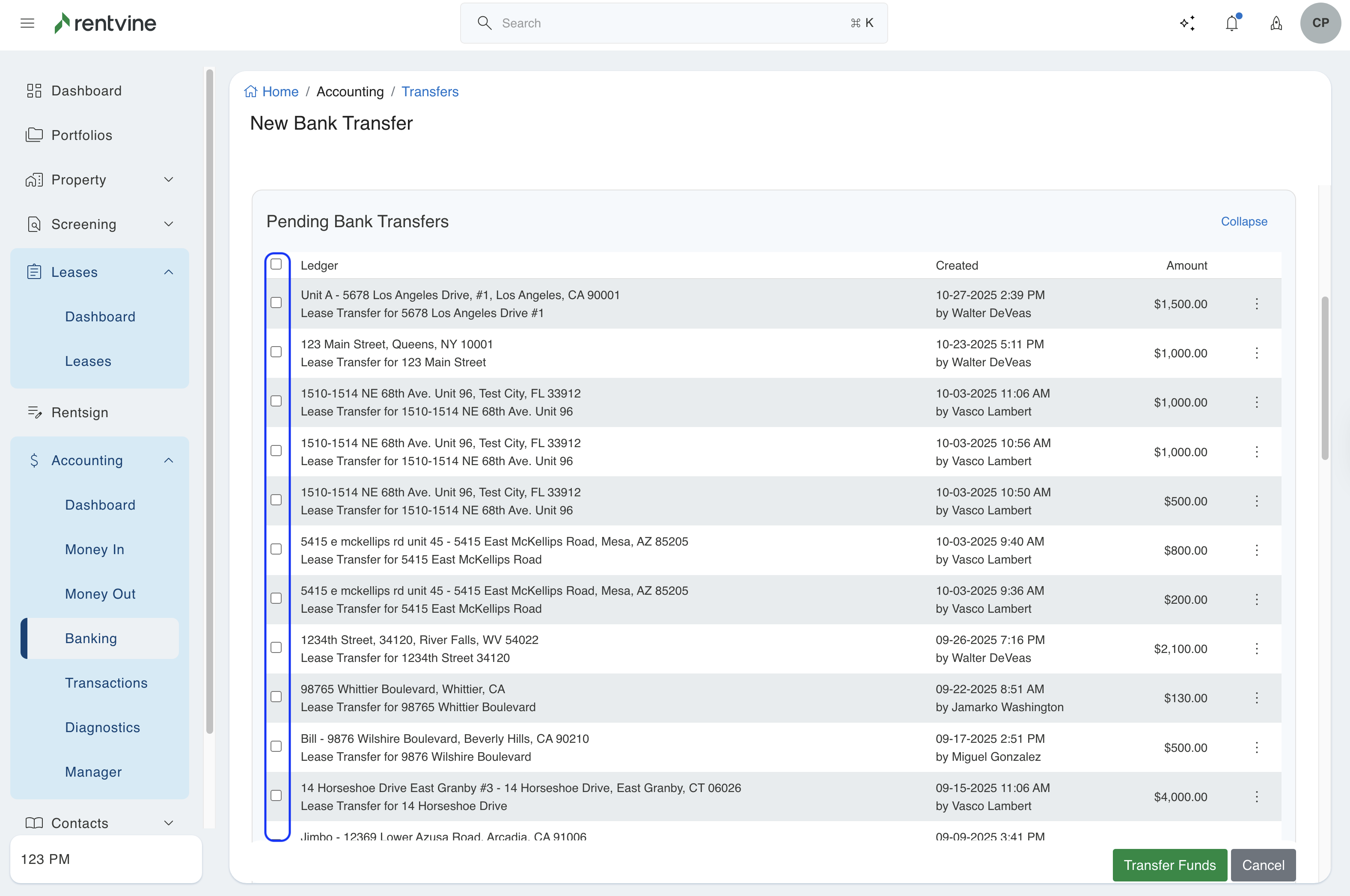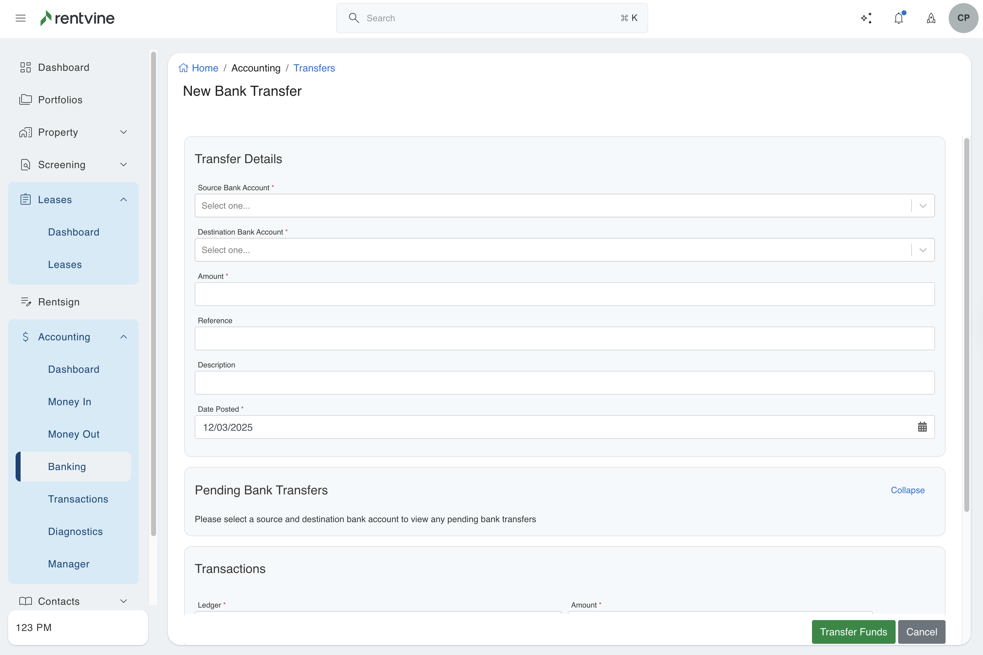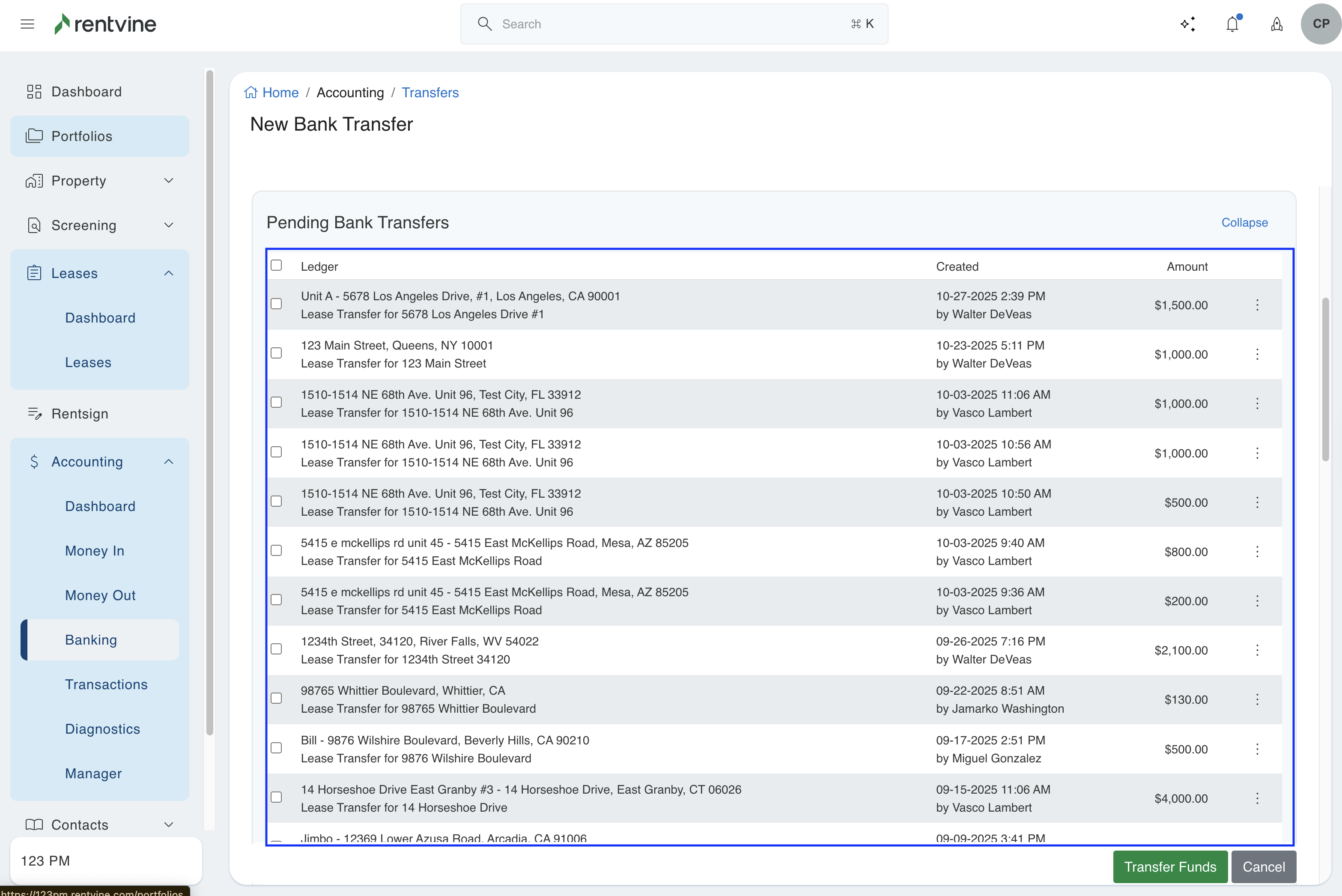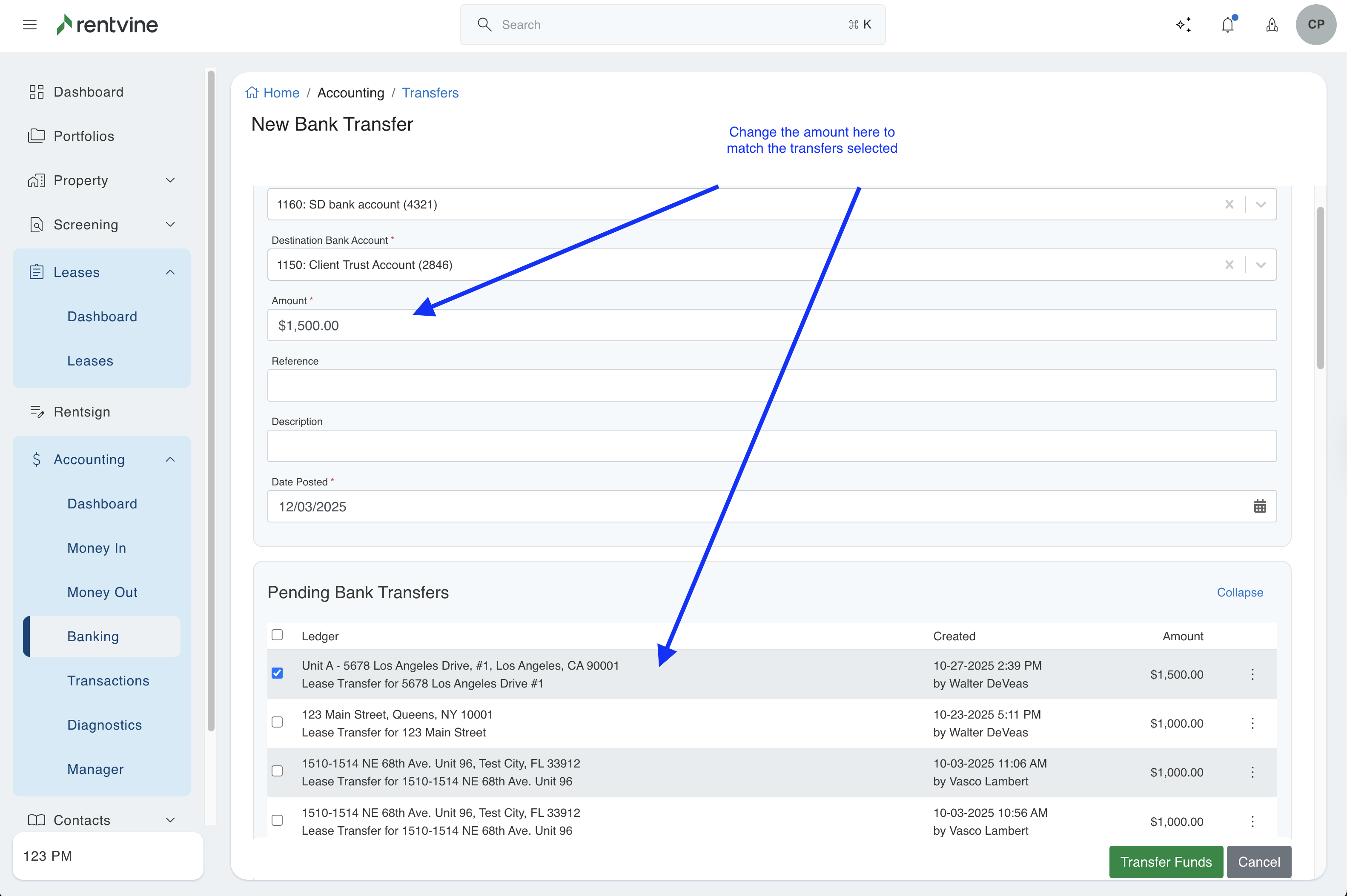 Please note that you will still need to complete a bank transfer in real life for these bank accounts. This will be for the amount you selected here. The transfer in Rentvine should match the date you recorded this bank transfer in real life. This is to make sure your reconciliations are balanced.