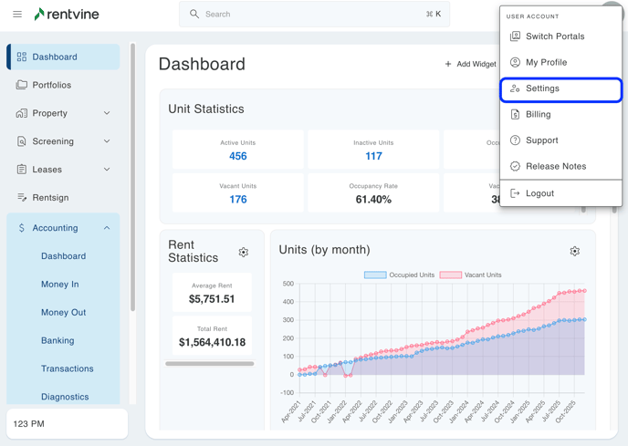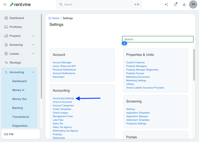 - To get started, you will first need to configure your accounting settings so discounts are enabled (This is usually done during onboarding, so if you already have this set up, skip to adding the discount). To set this up, you need to go to your global settings by clicking your initials in the top right and clicking "Settings". Then you will click "Accounting Settings."