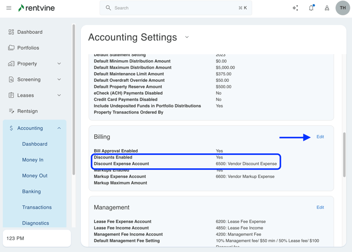 - When in here, you will scroll down until you find the settings labeled "Billing". If the toggle is off for "Vendor Discounts Enabled," click on the edit button and make sure this is toggled on, and select a default vendor discount chart of account.