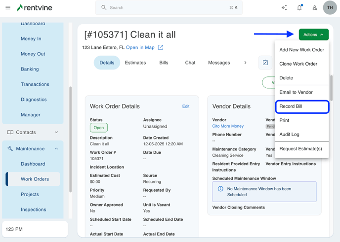 - Once the previous steps are complete, you can either go to a specific work order and add a bill or go to the accounting tab and add a bill. From a work order, click the green actions button and click record bill. This will automatically add the vendor as the payee on the bill. Since the vendor is already selected, you will see the field for Discount Amount. You can also manually adjust this amount if needed by selecting the field and entering the manual amount.