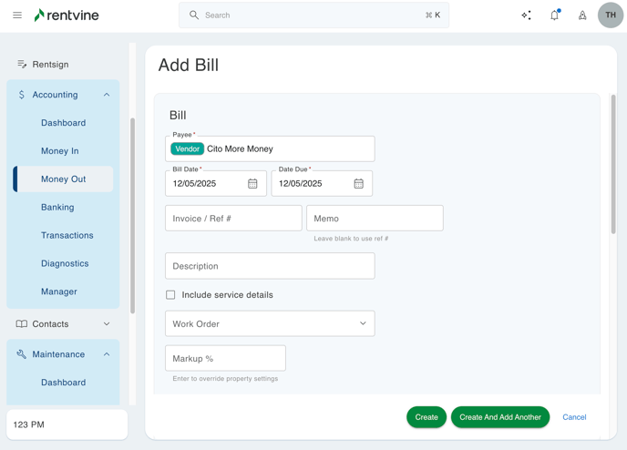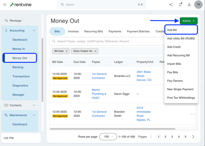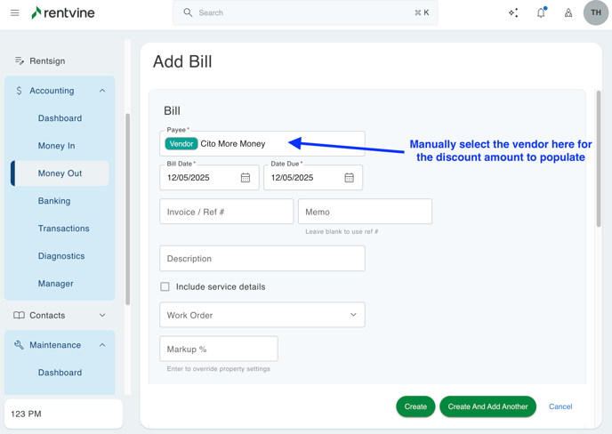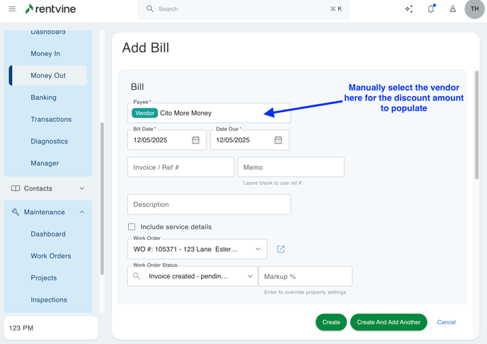 - Alternatively, you have the option to directly add a bill without the need for a work order. To do this, click the accounting tab and click money out. From here, click the green actions button and click "Add Bill". Once you select the vendor, you will see the field for Discount Amount. Again, the system will automatically reduce the bill by applying the discount tied to the vendor contact, or you can manually adjust the amount if needed.
