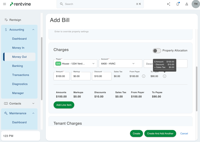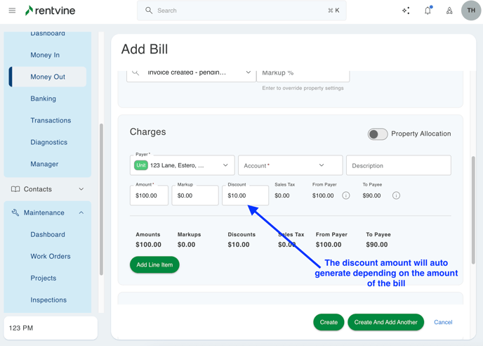 - Adding a discount amount will not reduce the amount the payer (typically the owner or unit) needs to pay on the bill. Instead, the owner or unit will be responsible for paying the full bill amount, while the vendor will receive a reduced payment based on the amount of the discount applied to the bill. The discounted portion of the payment that is withheld from the vendor will be allocated to your property management company. Consequently, the system will generate two bills for the owner: one for the vendor's specified amount and another for the discounted amount.