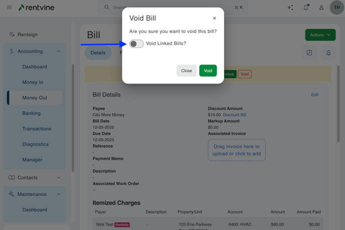 If you ever need to void a bill and a discount bill, you can click the green actions button and void one of the bills. This will give you the option to "Void Linked Bills". When this is toggled on, it will automatically void the original bill and the discount bill.