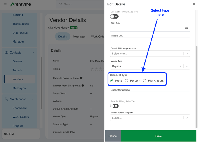 - If you want to have a vendor set with a default discount percentage, you can set this at the vendor contact details page. To do this, from the left navigation menu, go to contacts and click vendors. Click on a specific vendor to view their details. In the details box, you can click the pencil icon to edit. There is a field in here for discount percent or flat fee amount. The option entered here will automatically show on any bills where the vendor is selected as the payee.